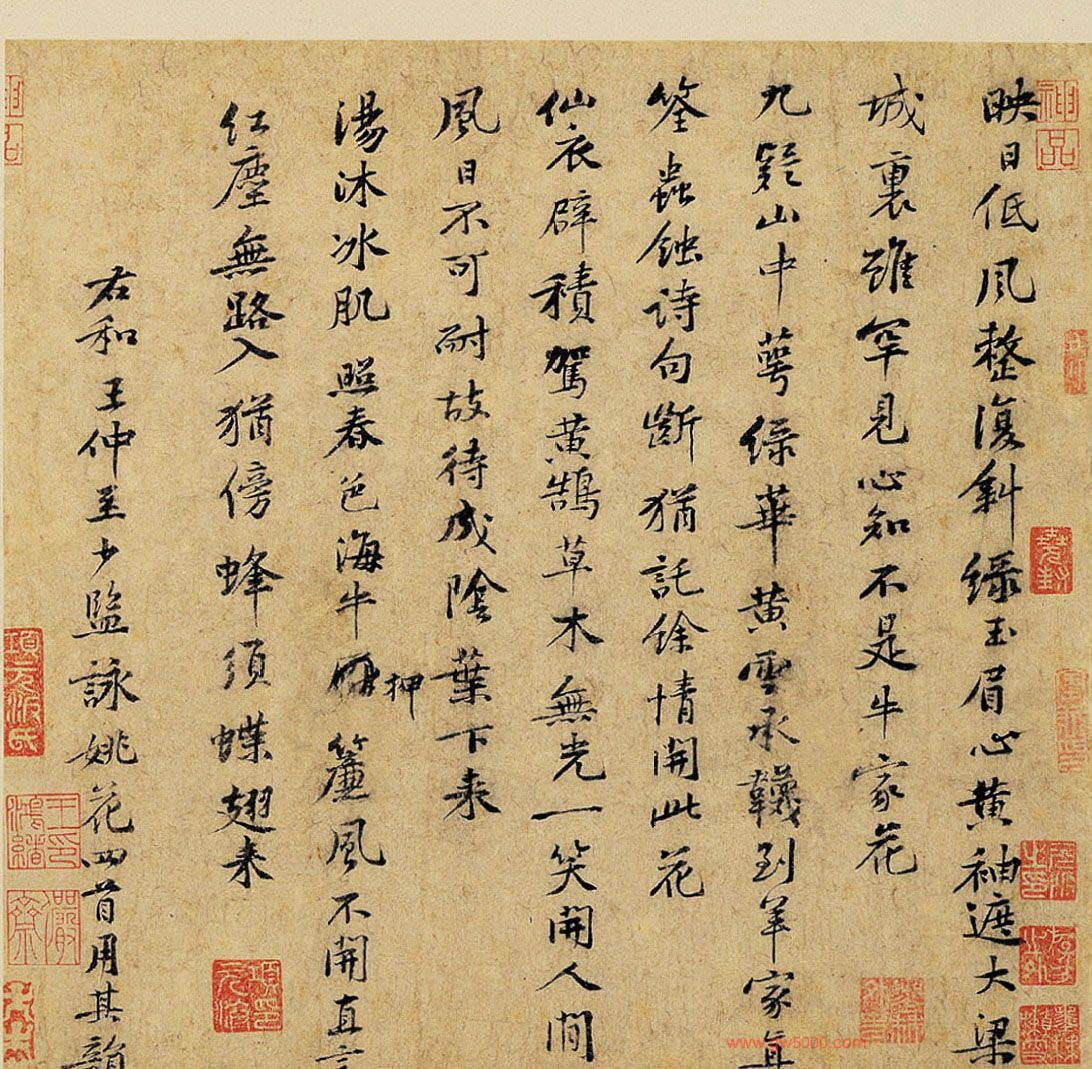 释文:映日低風整復斜。綠玉眉心黃袖遮。大梁城裡雖罕見。心知不是牛家花。九疑山中萼綠華。黃雲承韤到羊家。真筌蟲蝕詩句斷。猶託餘情開此花。仙衣辟積駕黃鵠。草木無光一笑開。人間風日不可耐。故待成陰葉下來。湯沐冰肌照春色。海牛。壓。押簾風不開。直言紅塵無路入。猶傍蜂須蝶翅來。右和王仲至少監詠姚花四首。用其韻。