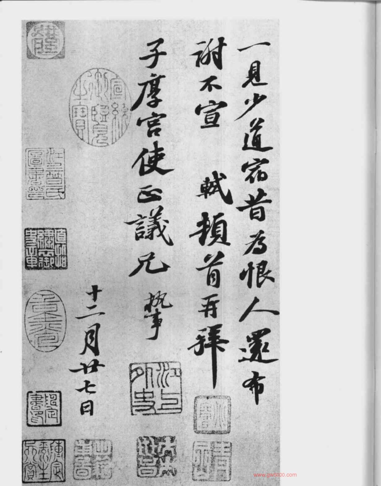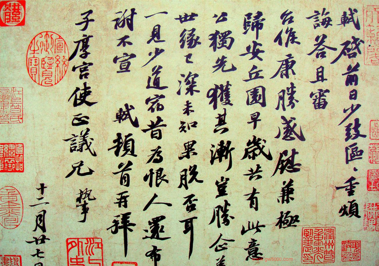释文:轼啟。前日少致区区。重烦诲答。且审台候康胜。感慰兼极。归安丘园。早岁共有此意。公独先获其渐。岂胜企羡。但恐世缘已深。未知果脱否耳。无缘一见。少道宿昔為恨。人还。布谢不宣。轼顿首再拜。子厚宫使正议兄执事。十二月廿七日。