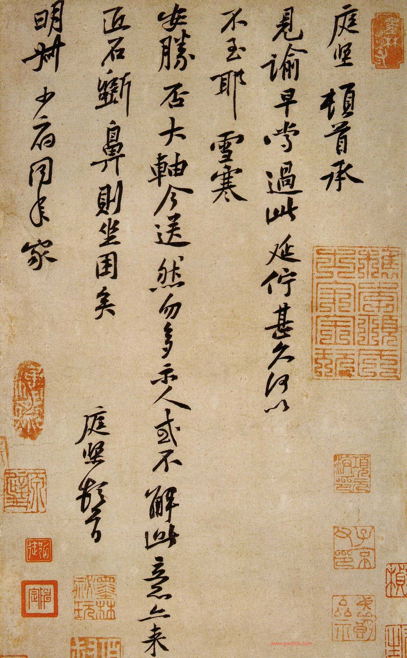 释文:庭堅頓首,承見諭,早嘗過此,延佇甚久,何以不至耶。雪寒,安勝否?大軸今送,然勿多示人,或不解此意亦來索,匠石斫鼻則坐困矣。庭坚顿首。明叔少府同年家。