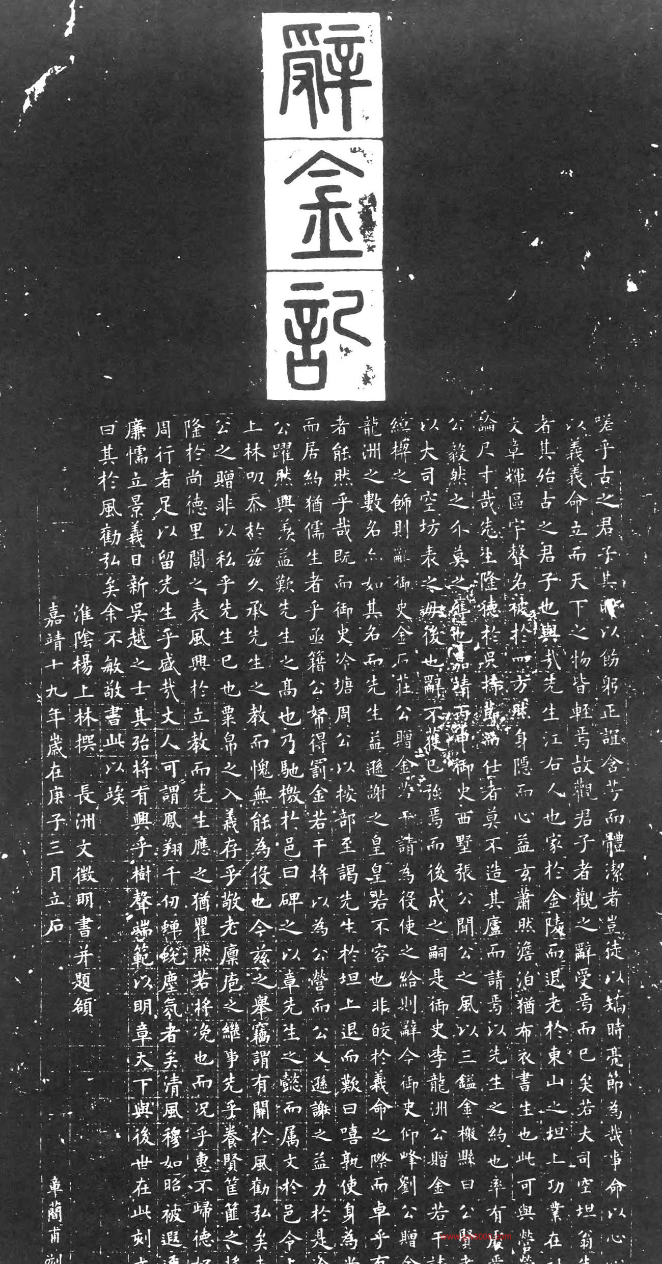 文徵明正書辭金記,嘉靖十九年(公元1540年)三月,楊上林撰文;文徵明書丹;章蕳甫刊石,拓紙通高100釐米、寬50釐米。
