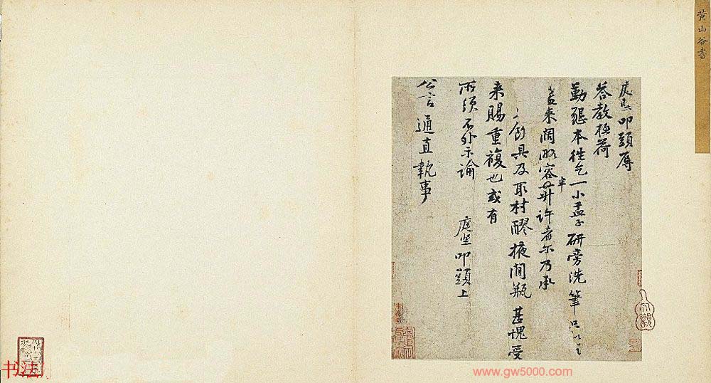 黄庭坚行书尺牍欣赏《勤恳帖》纸本,亦称《致公言通直执事尺牍》》、《示谕帖》,27.9×24.8厘米,无书写时间,从笔法、结体、书风等方面综合判断,应是早年所书,大约书于1086一l093元祐年间。台湾故宫博物院藏。