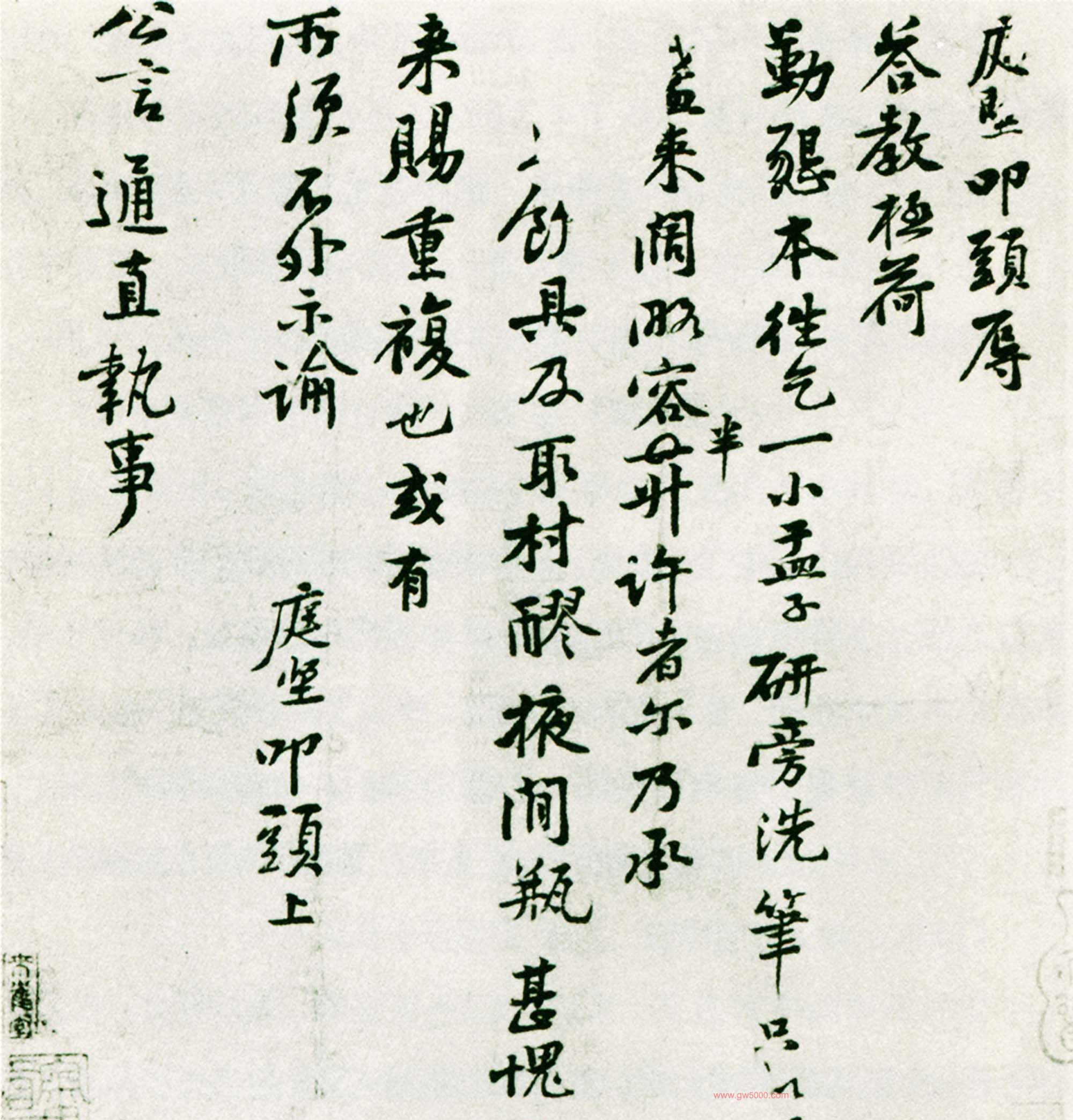 释文:庭堅叩頭。辱答教。極荷勤懇。本往乞一小盂子。研旁洗筆。只□□□來濶。略容半(一字點去)升許者爾。乃承□□□飲具及取村醪掖閒瓶。甚愧,受來賜重複也。或有所須不外示諭。庭堅叩頭。上公言通直執事。 庭坚叩头,辱答教,极荷勤恳,本往乞一小孟子,研旁洗笔,只口口盏来阔,略容半升许者尔,乃承口口口饮具及取村醒掖闲瓶,甚愧,受来赐重複也。或有所须不外示谕,庭坚叩头上。公言通直执事。