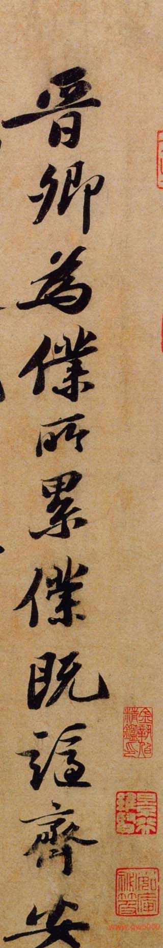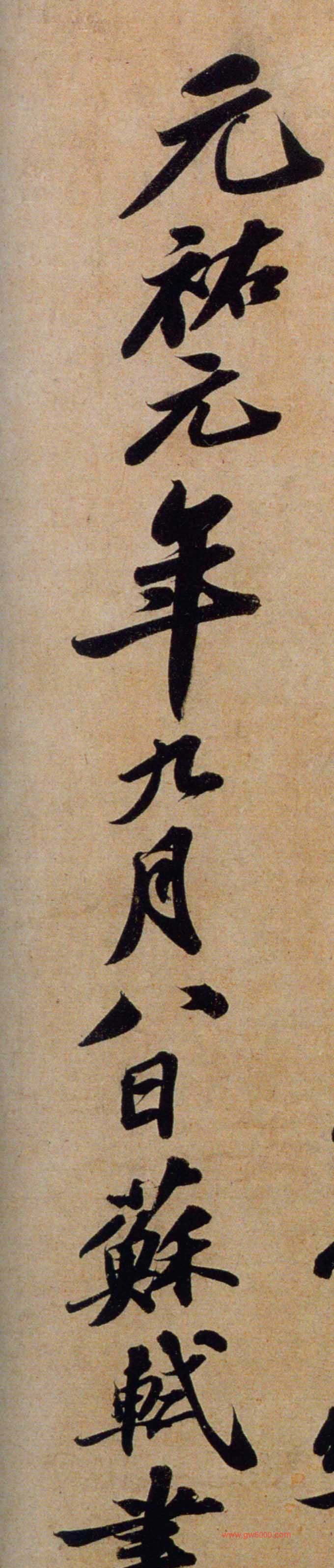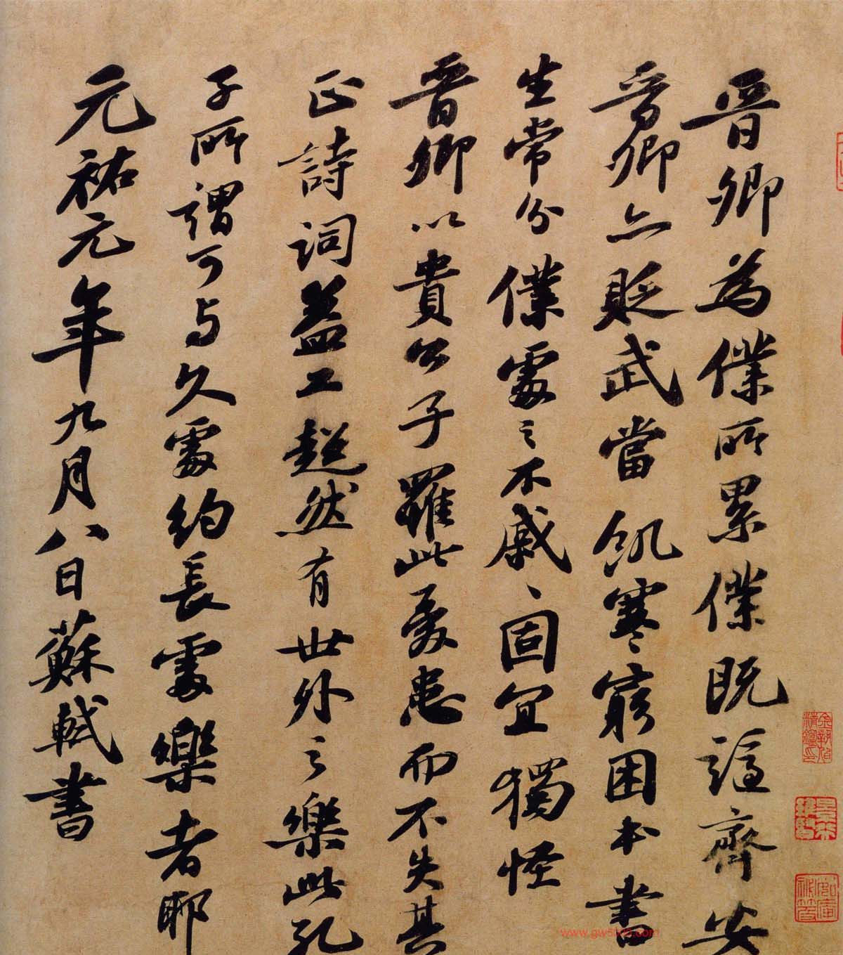 释文:晋卿为僕所累,僕既谪齐安。晋卿亦贬武当,饥寒穷困,本书生常分,僕处之不戚戚,固宜独怪。晋卿以贵公子罹此忧患而不失其正,诗词益工,超然有世外之乐,此孔子所谓可与久处约长处乐者耶!元祐元年九月八日苏轼书