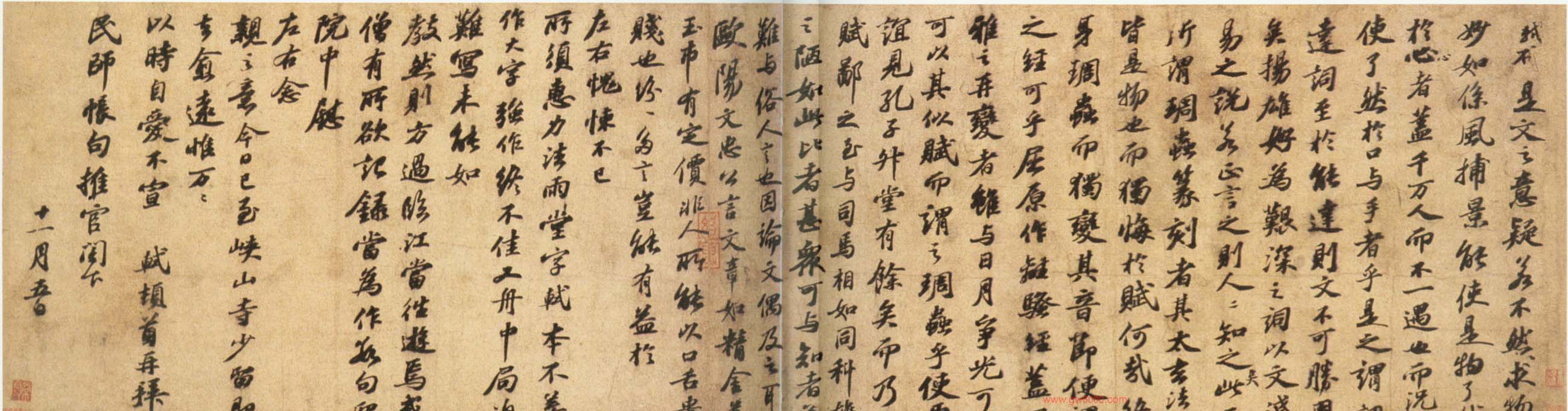 苏轼行书长卷《东坡与民师书真迹》纸本,纵27厘米横96.5厘米,上海博物馆藏。 元符三年(1100)五月,苏轼由儋州内调,九月过广州。谢民师以诗文求教,二人相处甚洽。此卷为苏轼离广州后写给谢民师的第二封信。信中表达了自己的文学见解,特别阐发了艺术传达的规律:一是要“文”,“言之不文,则行而不远”;二是要“达”,“辞至于能达,则文不可胜用”。但艺术传达是有条件的,这就是“使物了然于心”、“了然于口与手”。艺术传达还要讲求方法,他主张以平和的言辞抒情达意,“行于所当行,止于所不可不止”,就会“文理自然”。批评了扬雄“好为艰深之辞”、只在雕篆上下功夫的作法。这些见解都是十分精当的。现存墨迹已阙文章篇首部分。