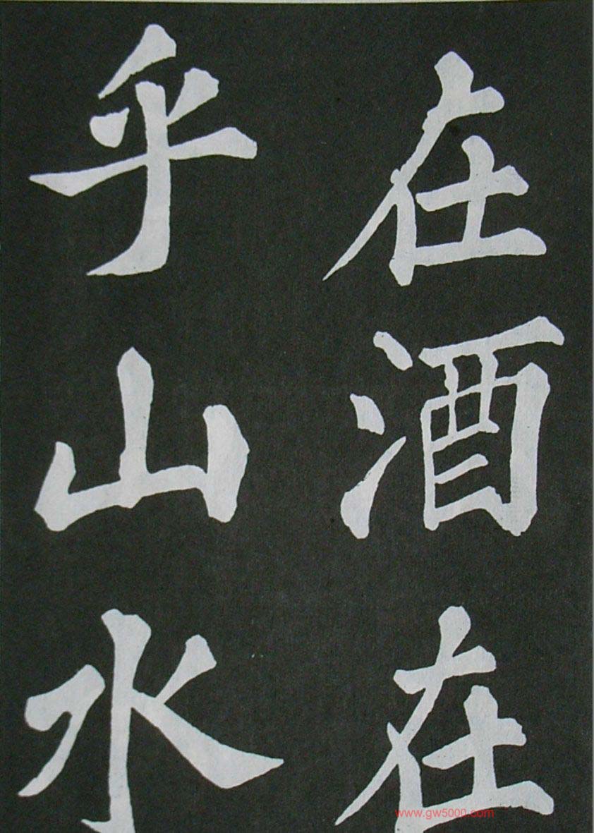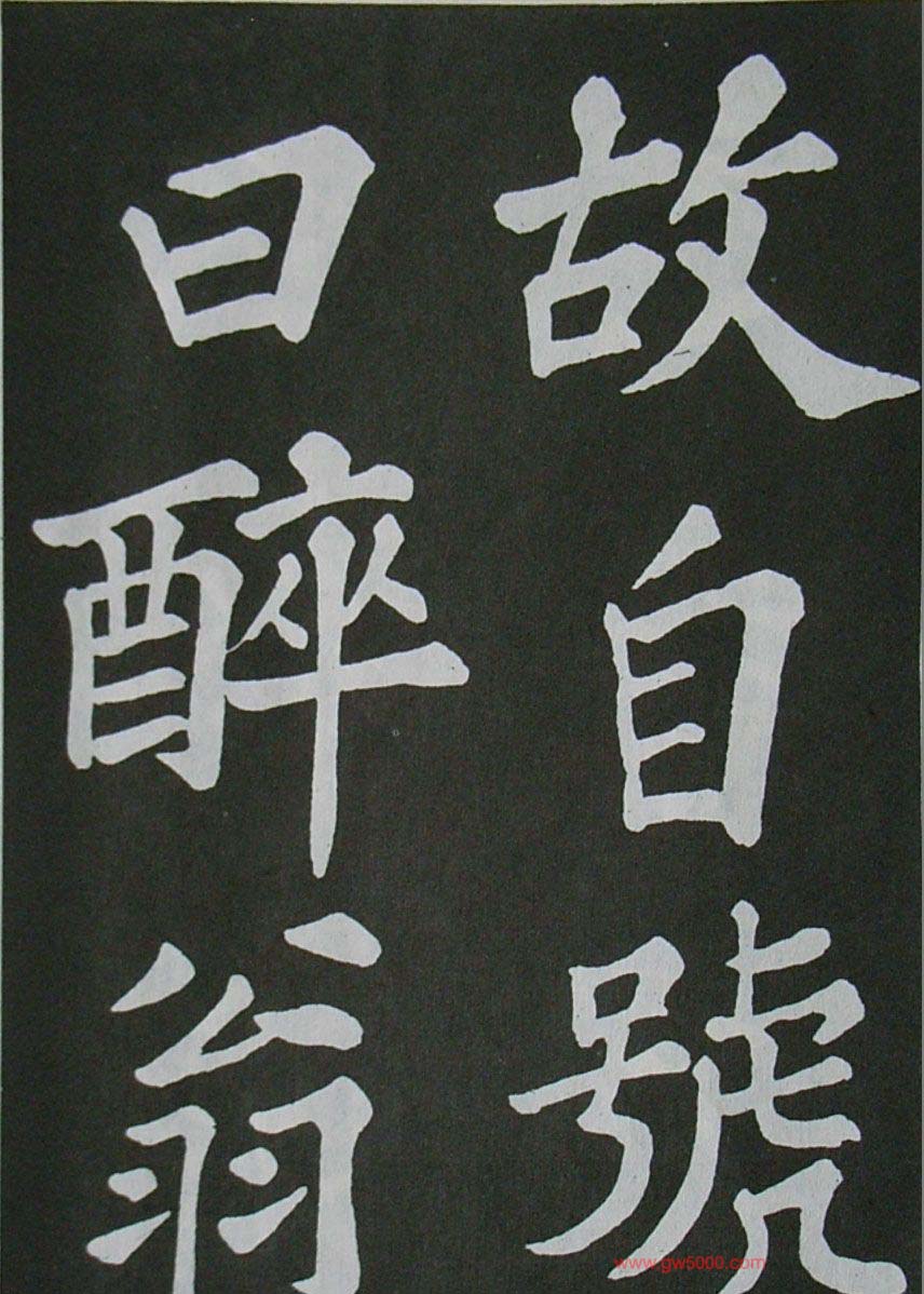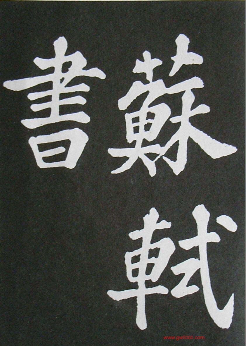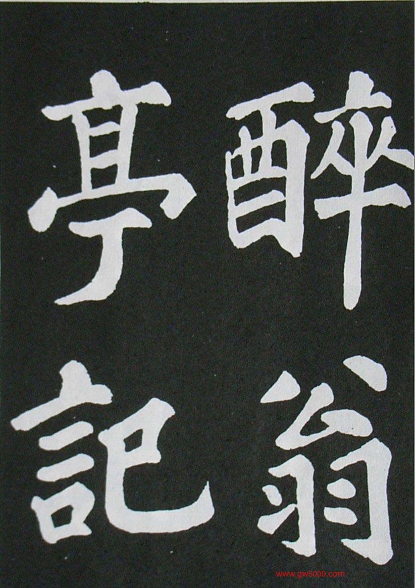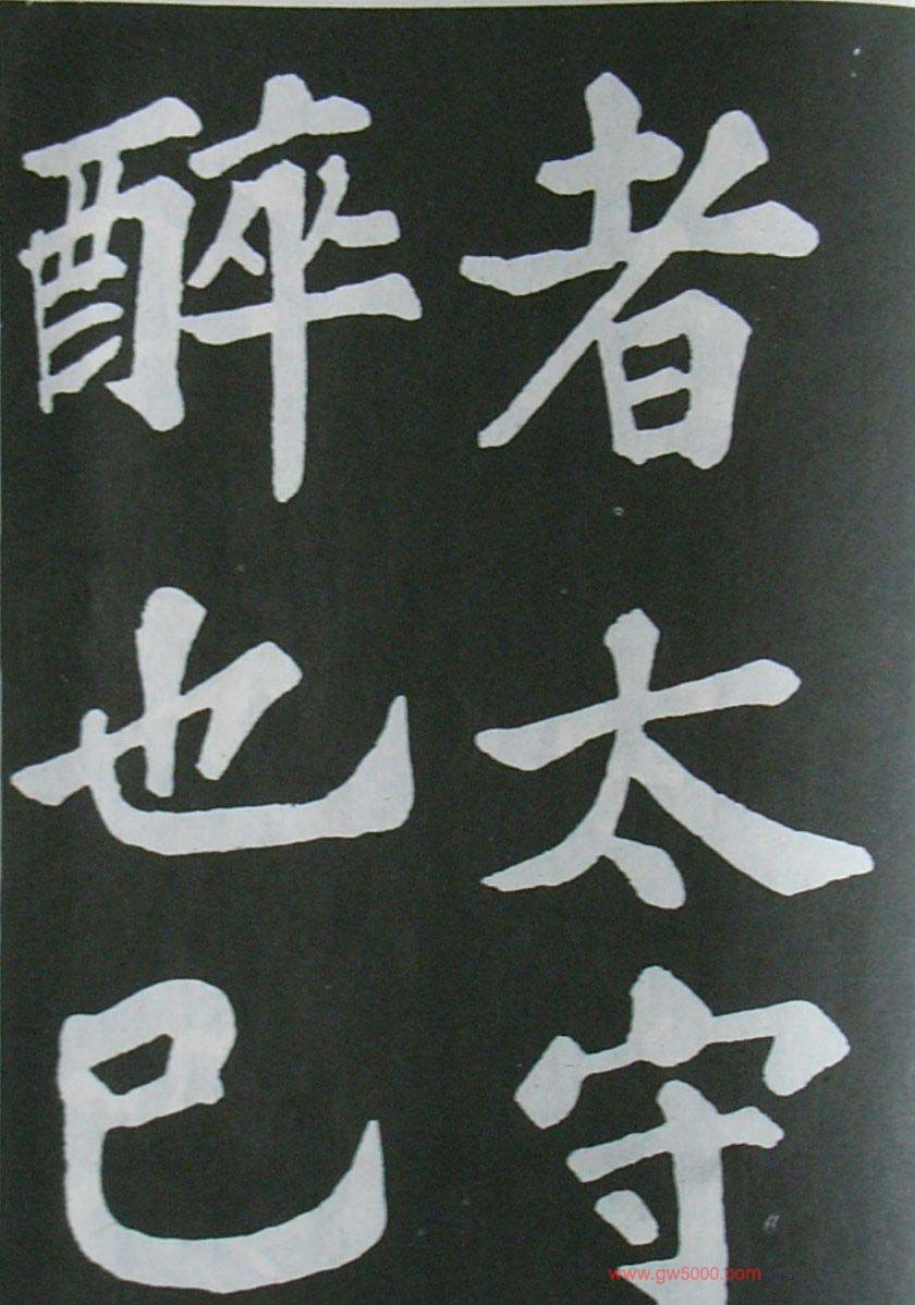 《醉翁亭记》,欧阳修撰,苏轼书。宋元祐六年(1091)十一月刻石,在安徽省全椒县。原石宋时已毁,明嘉靖间重刻石。宋刻本字有漫漶,但书体远在明刻本之上。今拓明刻本分四张拓,前三张七行,末张五行,行二十字。此碑书于欧阳修逝世后近二十年,无一笔松懈,无一字不缜密。在笔画的披拂之间既得其遭劲,又显示洒脱之美,其捺与撇往往十分舒展,如举手投足之自如萧散。笔笔用力,沉着宽厚,显出雄强;而又巧寓对比,错综变化,显示灵逸。比如“醉”字的“酉”旁共有四竖画,先用一分,继用二分,最末用三分笔。“提携”两字均为左右结构,又上下相联,苏武却将下一“携”字改为上下结构,使“扌”旁置于“乃”字上。赵孟頫《松雪斋》云:“余观此帖潇洒纵横,虽肥而无墨猪之状,外柔内刚,真所谓绵里裹铁也。”王世贞评:“苏书《醉翁亭记》,结法遒美,气韵生动,极有旭素屋漏痕意。”李长善认为:“文忠早师颜鲁公,大书《醉翁亭》、《袁州学记》,不改鲁公家法。”可谓知言。