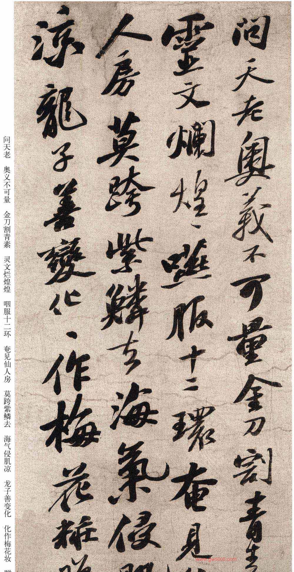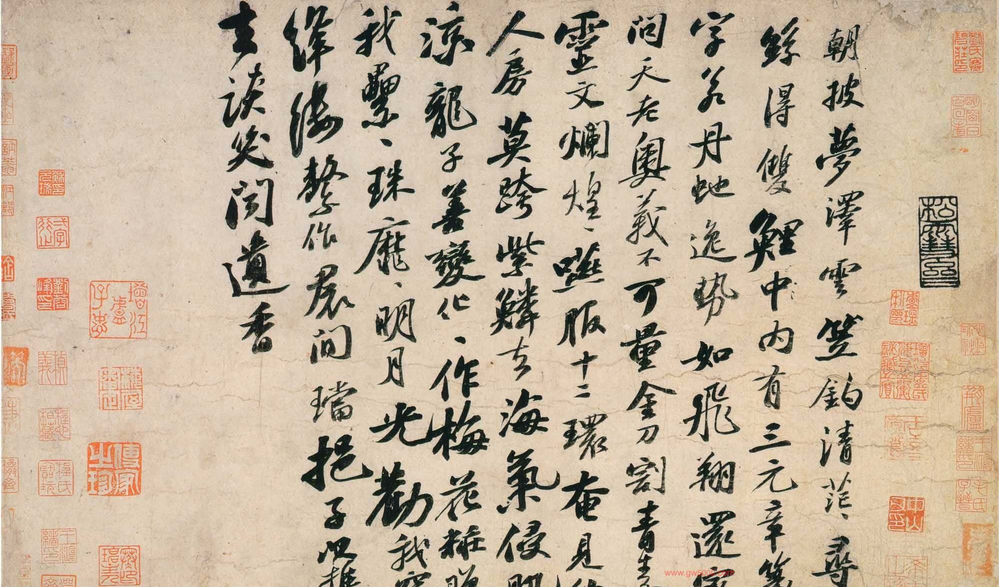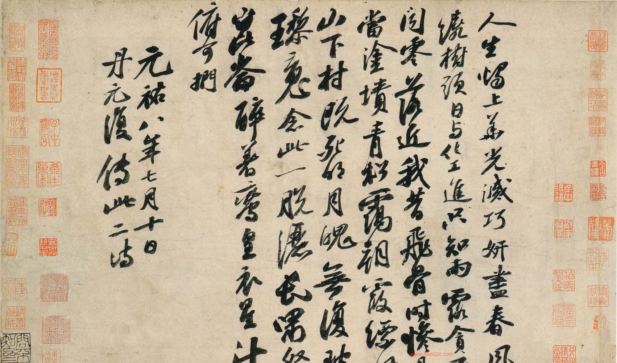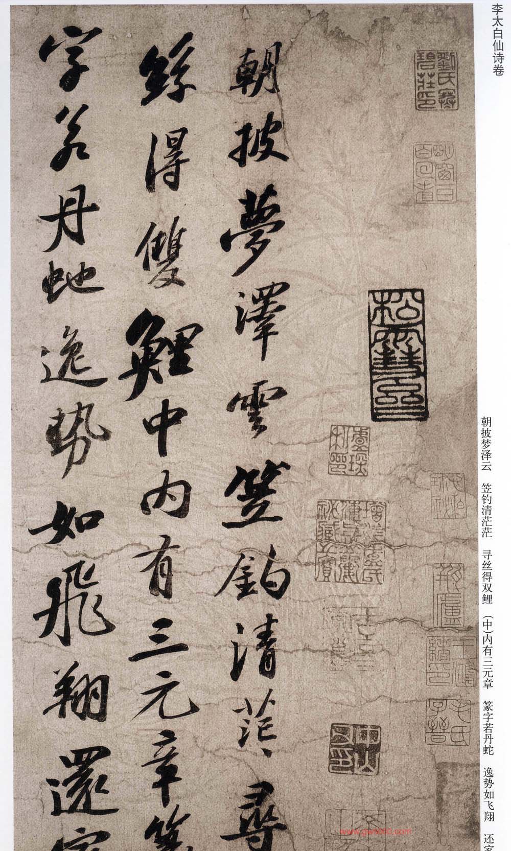 该帖为苏轼58岁时书。清高士奇《江村销夏录》著录。后有蔡松年、施宜生、刘沂、高衍及张弼、高士奇、沈德潜等明、清人跋。此帖已流入日本。施宜生谓“颂太白此语。则人间无诗,观东坡此笔则人间无字。”此两诗为逸诗《李太白文集》所不载。太白之诗共两首。第一首娓娓道来,仙气拂拂,引人入胜。第二首凄清空逸超脱人寰。书则第一首灵秀清妍,姿致翩翩,后十句渐入奇境,变化多端,神妙莫测。第二首驰骋纵逸,纯以神行人书合一,仙气飘渺,心随书走,非复人间之世矣。此书境界,颇难企及。