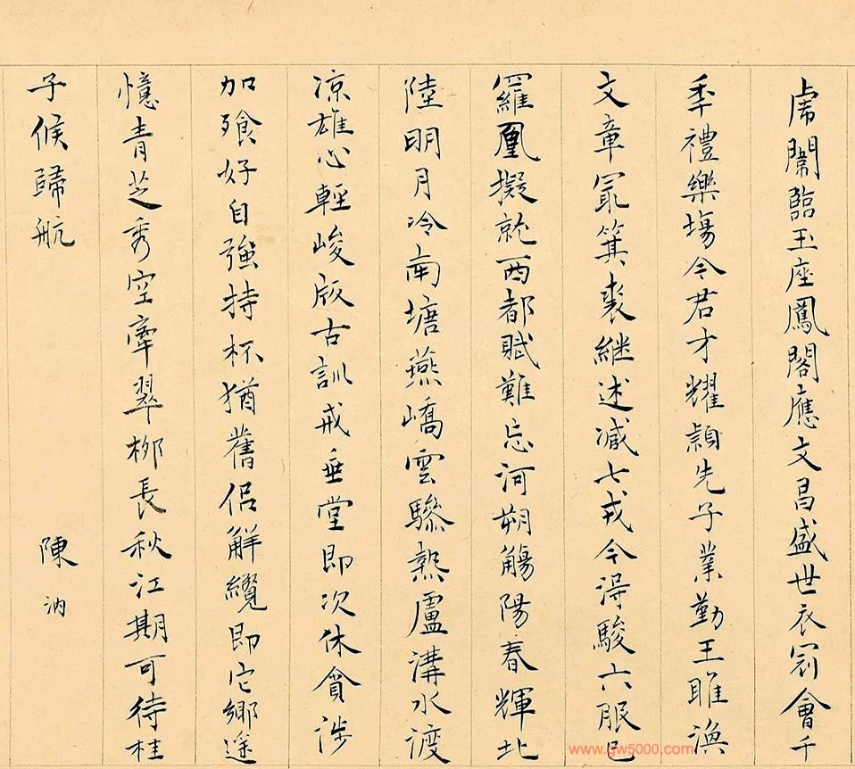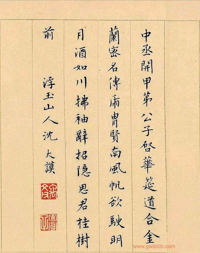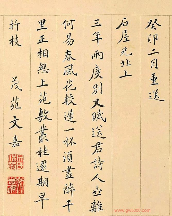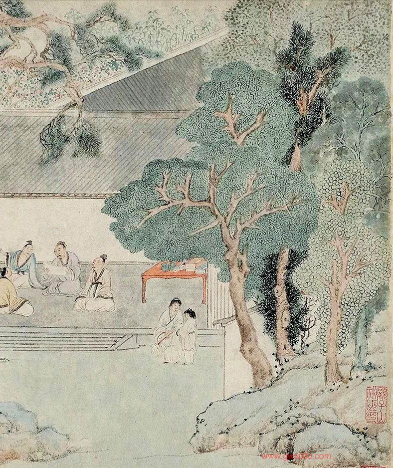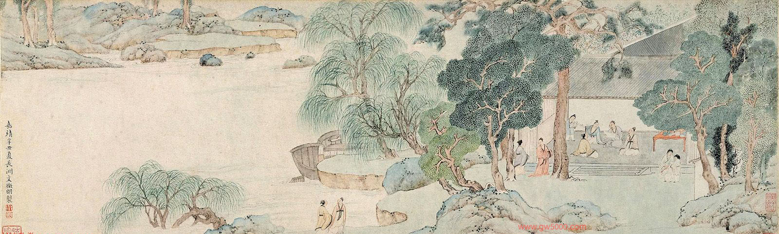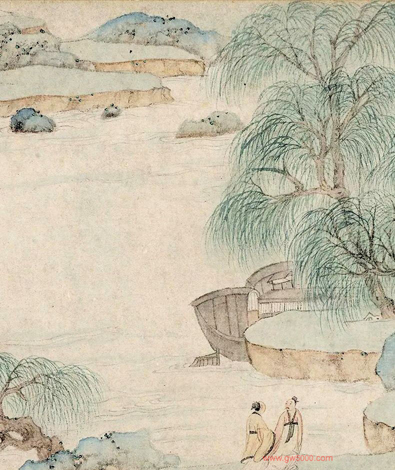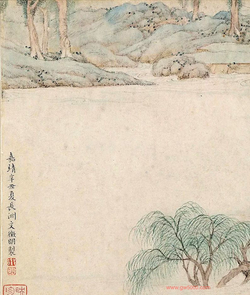 此卷文徵明所作《溪堂宴别图》,是为毛锡嘏于嘉靖辛丑(1541年)北上北京贡入太学所作。毛锡嘏是“名宦”毛珵次子,毛珵为都察院右副都御史,宁王反叛进逼南京之时,毛珵提出“水陆并进,征讨叛臣”的积极建议,配合兵部尚书乔宇,与巡抚、都御史王守仁一起讨伐朱宸濠叛军,立下赫赫战功,是吴地历史上颇有政绩的好官。毛珵和沈周、文徵明、祝允明等关系友善,并有诗书往来,毛珵与文徵明相交于正德七年,且毛珵长子锡朋妻子为文徵明叔父文森之女。这种关系应该是后来毛锡嘏拜师文徵明的原因之一。