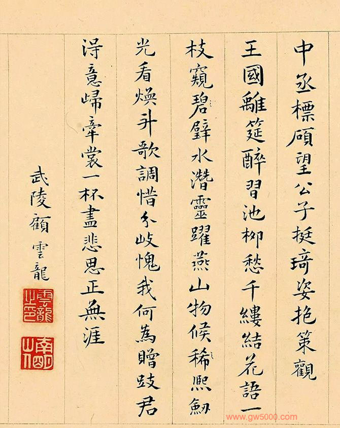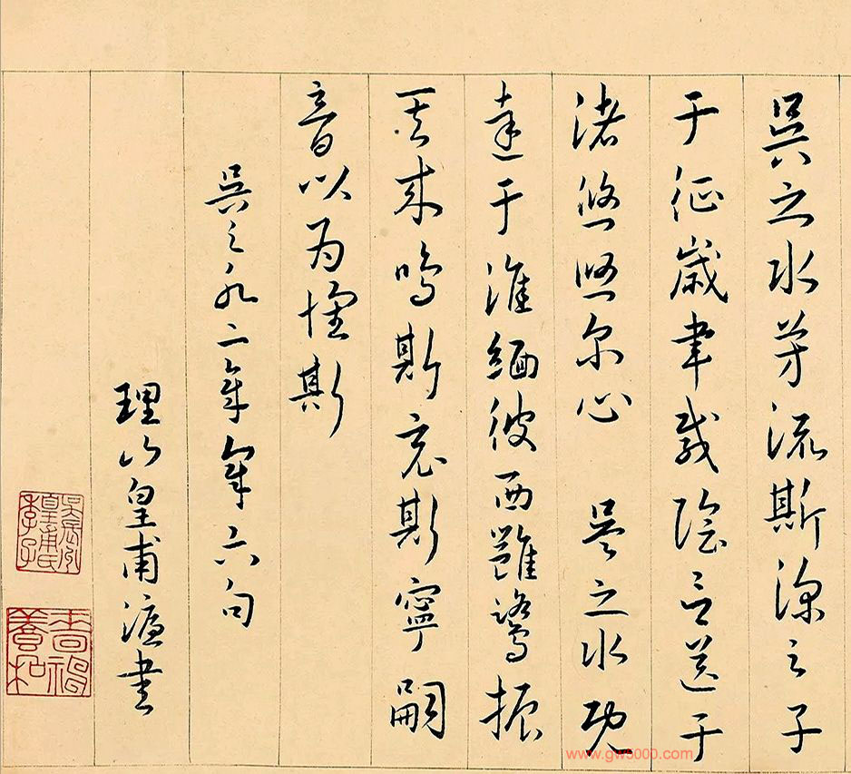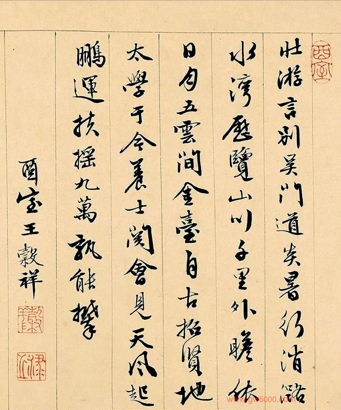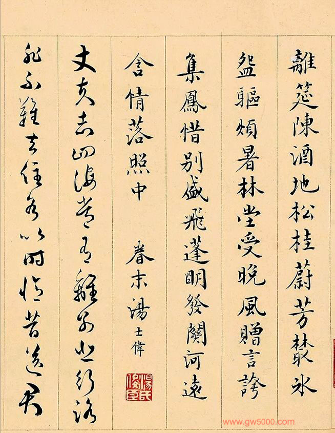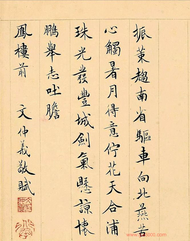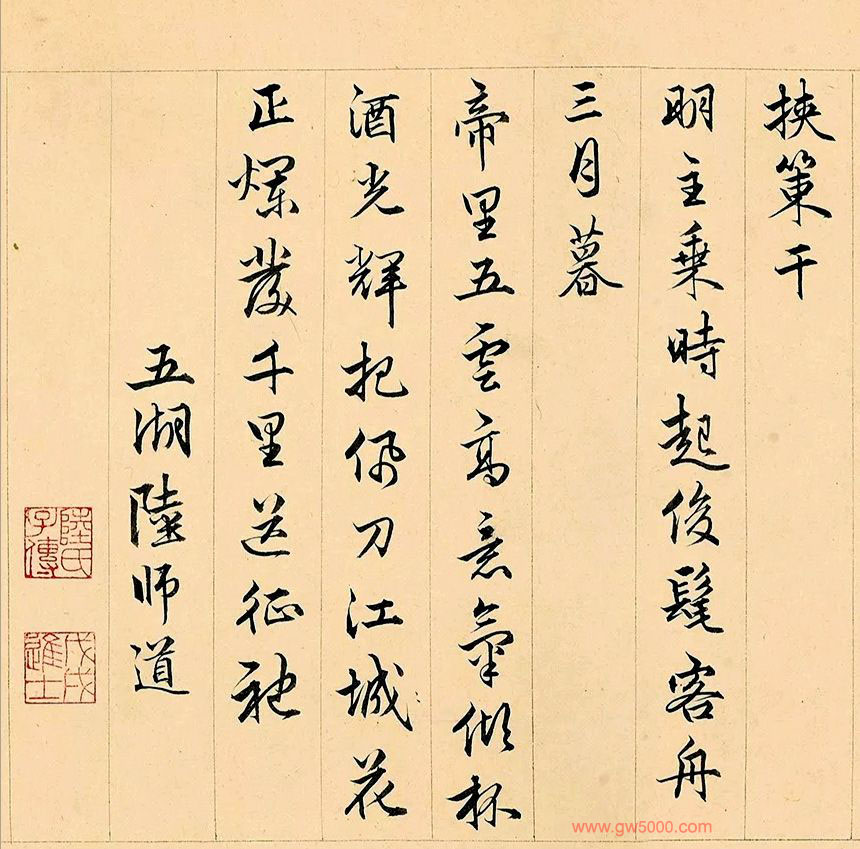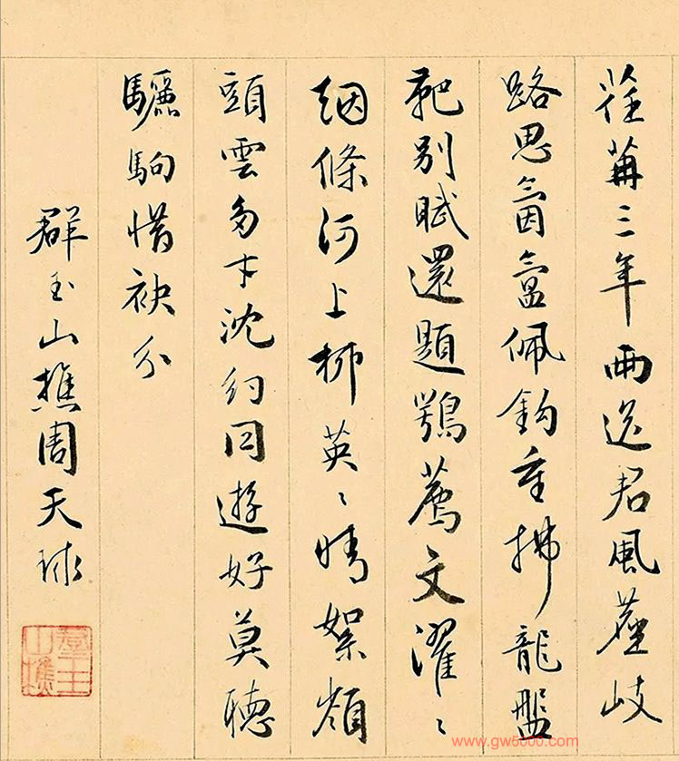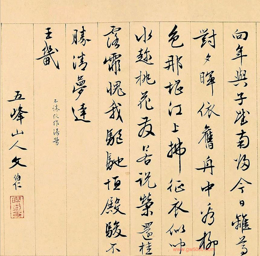 此卷文徵明所作《溪堂宴别图》,是为毛锡嘏于嘉靖辛丑(1541年)北上北京贡入太学所作。毛锡嘏是“名宦”毛珵次子,毛珵为都察院右副都御史,宁王反叛进逼南京之时,毛珵提出“水陆并进,征讨叛臣”的积极建议,配合兵部尚书乔宇,与巡抚、都御史王守仁一起讨伐朱宸濠叛军,立下赫赫战功,是吴地历史上颇有政绩的好官。毛珵和沈周、文徵明、祝允明等关系友善,并有诗书往来,毛珵与文徵明相交于正德七年,且毛珵长子锡朋妻子为文徵明叔父文森之女。这种关系应该是后来毛锡嘏拜师文徵明的原因之一。