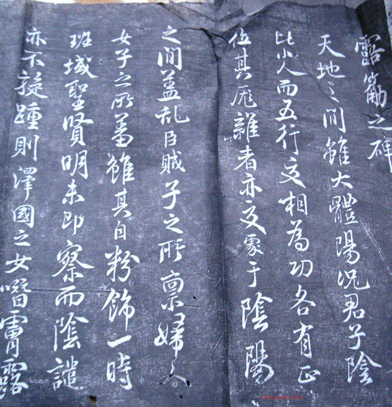 露筋之碑,天地之间,虽大体:阳况君子,阴比小人,而五行交相为功,各有正位。其庞杂者,亦交处于阴阳之间,盖乱臣贼子之所禀,妇人女子之所羞。虽其粉饰(阙)时班,域圣贤明,未即察而阴谴,亦不旋踵,则泽国之女,噆肤露筋,不就有帏之子氏,不显于一时,祠方揭于千古,庸夫庸妇之所传,称有如昨日,是幽显之所共信,而古今不可得而议者,然则,伯夷叔齐之节,不必俟圣人万世,所自知明矣。