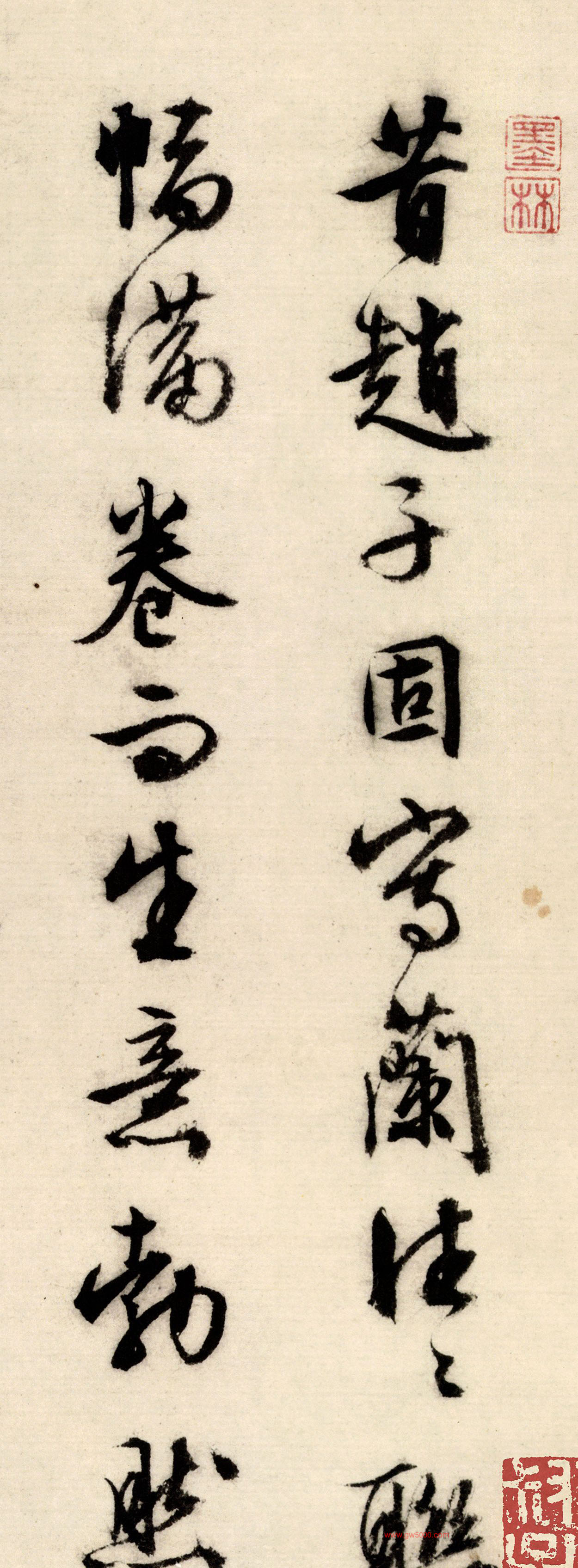 释文:昔赵子固写兰,往往联幅满卷,而生意勃然,郑所南踈花老叶,仅仅数笔而生意亦足,子固孟字王孙而郑公忘国遗老,盖繁简不同,各就其所见云耳。余雅爱二公之笔,每适兴必师二公,此卷虽意匠子固,而所南本色,亦时时一见,观者(知)当知之。徵明。