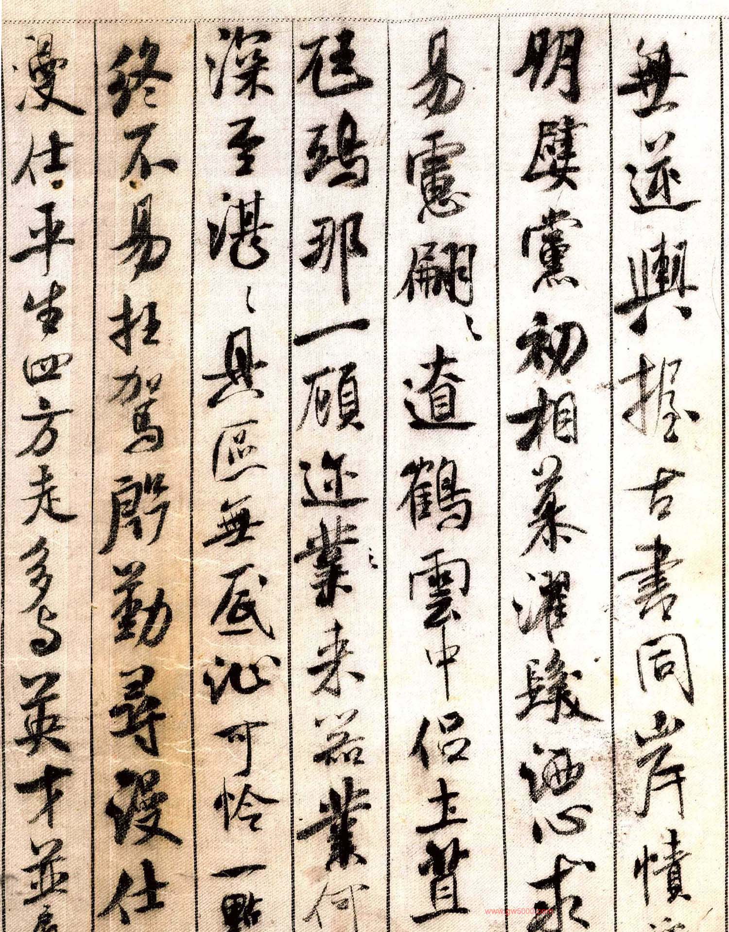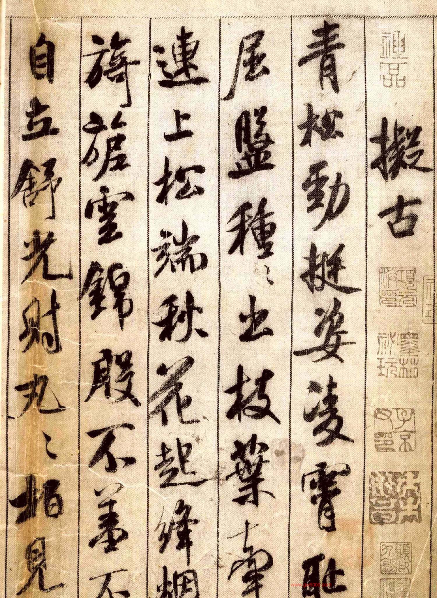 《蜀素帖》书于乌丝栏内,但气势丝毫不受局限,率意放纵,用笔俊迈,笔势飞动,提按转折挑,曲尽变化。《拟古》二首尚出以行惜,愈到后面愈飞动洒脱,神采超逸。米芾用笔喜"八面出锋",变化莫测。此帖用笔多变,正侧藏露,长短粗细,体态万千,充分体现了他“刷字”的独特风格。因蜀素粗糙,书时全力以赴,故董其昌在《蜀素帖》后跋曰:“此卷如狮子搏象,以全力赴之,当为生平合作”。 另外,由于丝绸织品不易受墨而出现了较多的枯笔,使通篇墨色有浓有淡,如渴骥奔泉,更觉精彩动人。