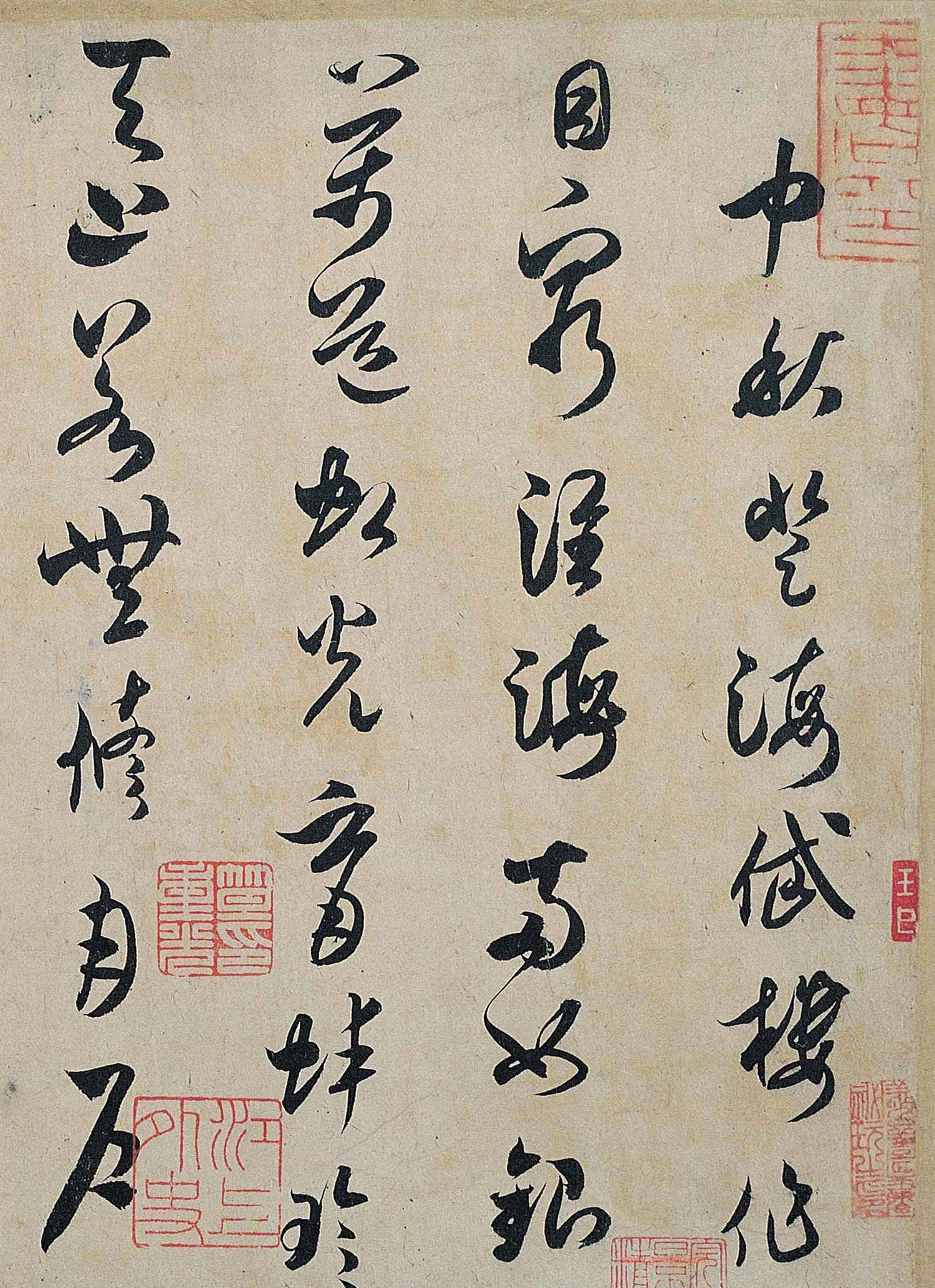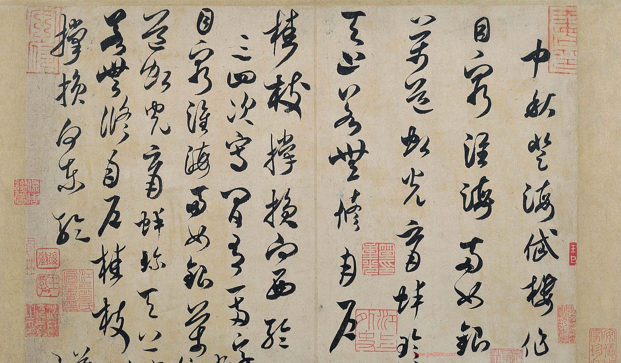 米芾草书作品赏析《中秋登海岱楼作诗帖》,又称《中秋诗帖》,纸本,纵25.2厘米,横36厘米。日本大阪市立美术馆藏。