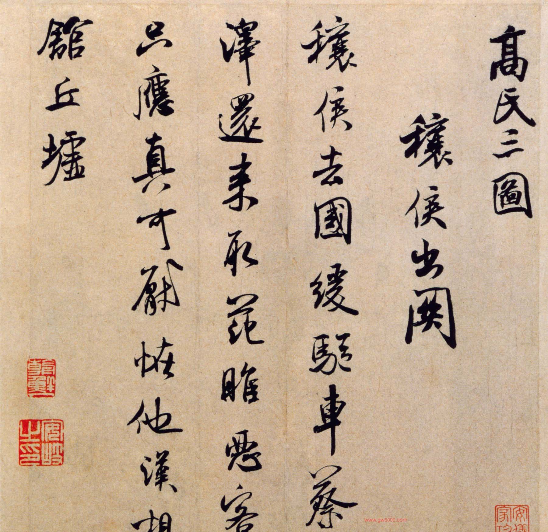 米芾行书作品欣赏《穰侯出关诗帖》,又称《高氏三图》诗,麻、楮混料纸,纵29.4厘米,横26.4厘米,北京故宫博物院藏。