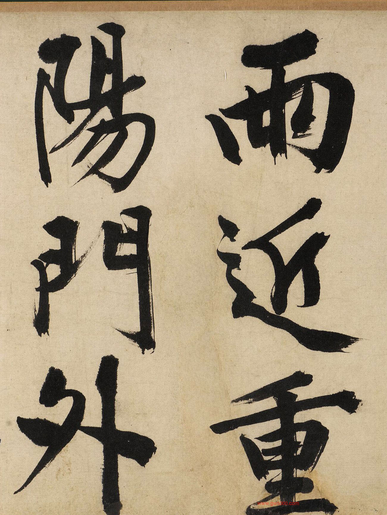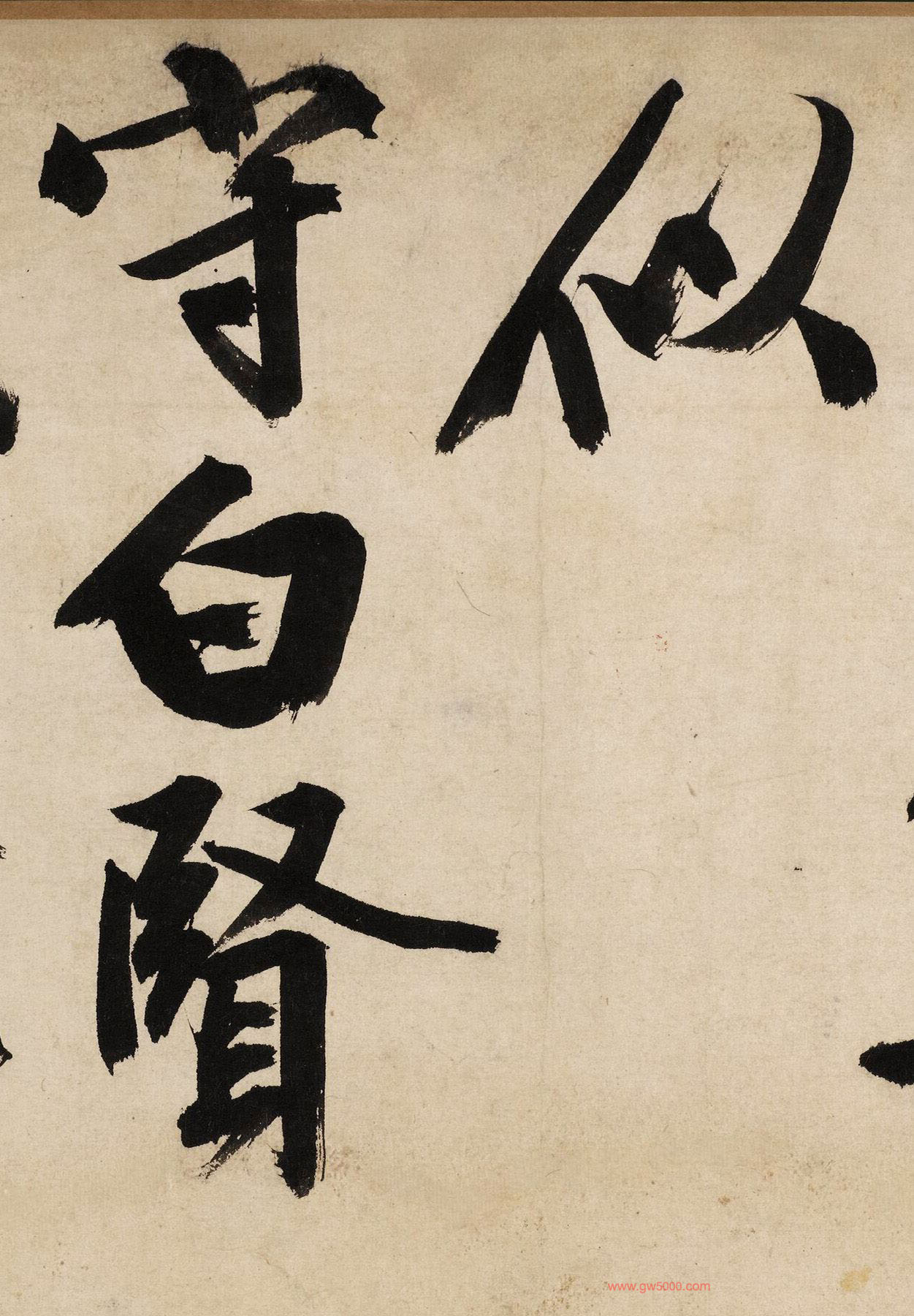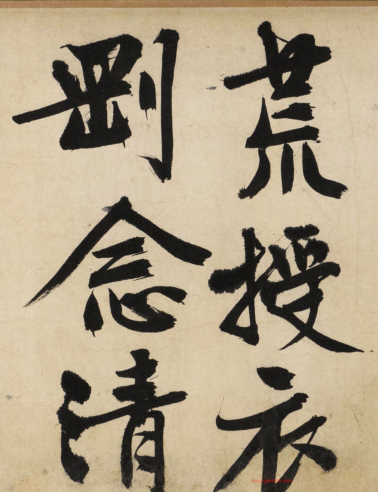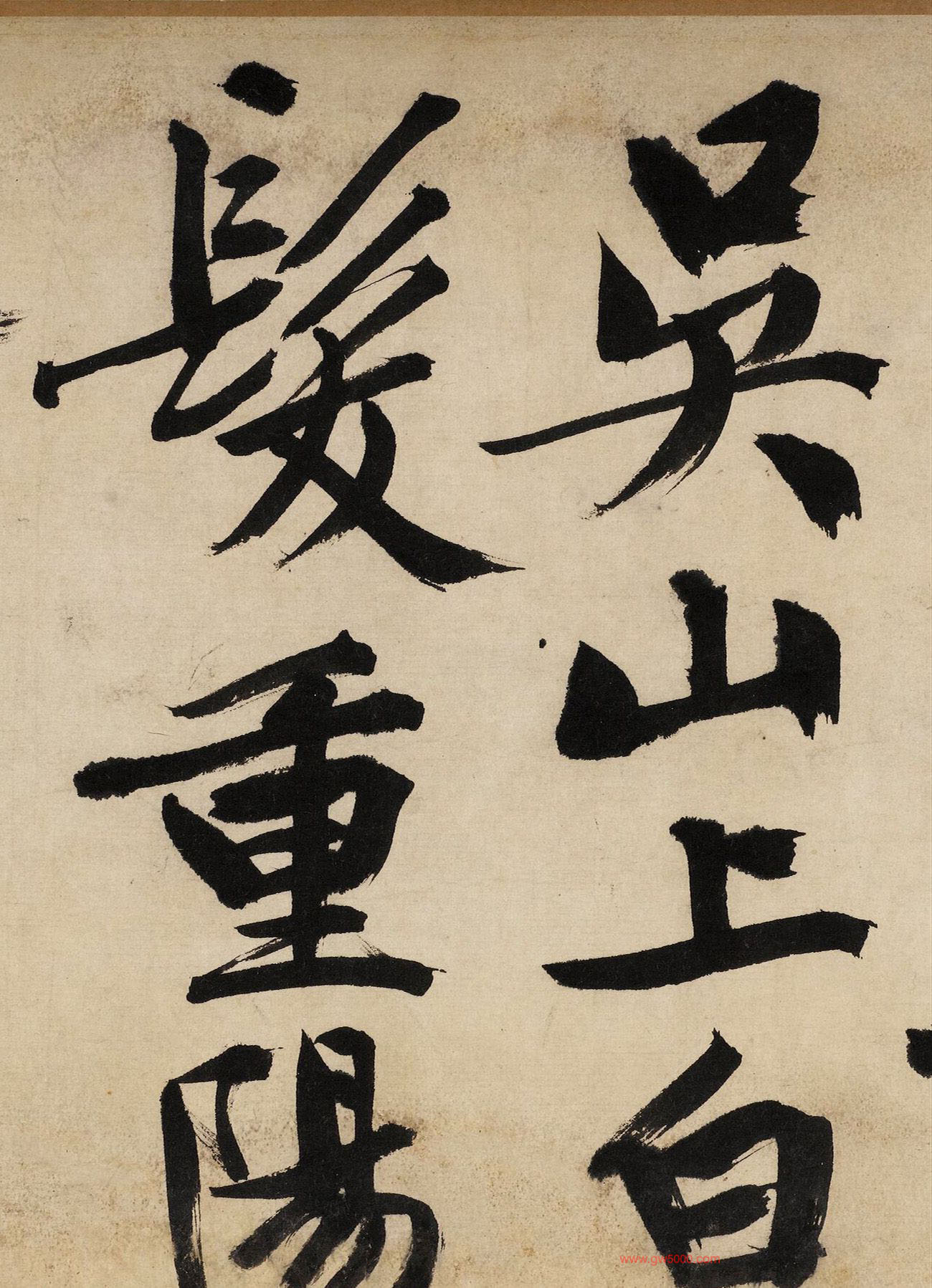 文徵明晚年仿黄庭坚风格的大字作品非常多,均为大字行楷书,时间多在最后十几年之间,且更多一种老辣之气。这幅作品是书写赠给王榖祥的,为文徵明垂老之笔,毫锋散乱,文氏的老态龙钟可以想见。但书写自己的诗作却仍是神采奕奕,结体沉稳,全篇无一懈笔,一片天真烂漫之象。