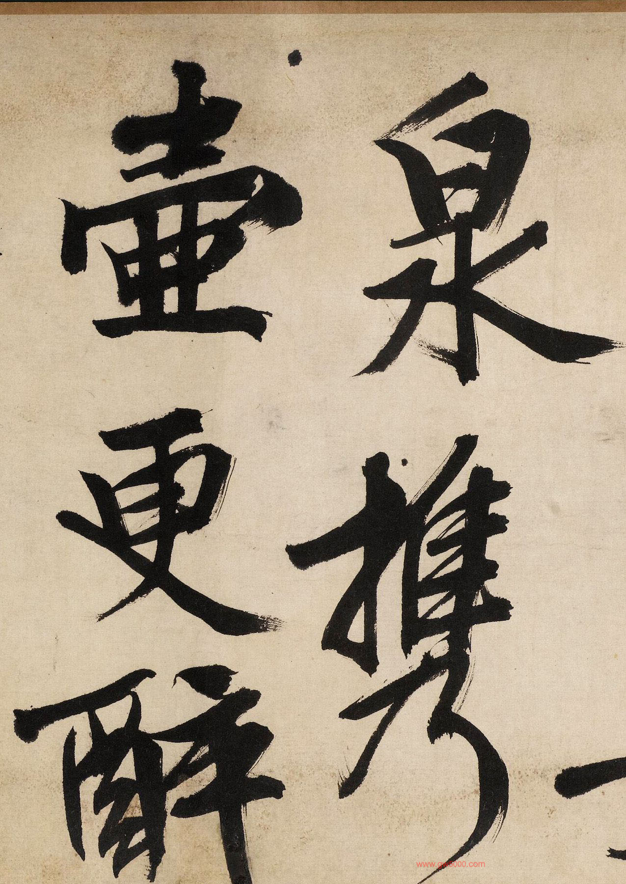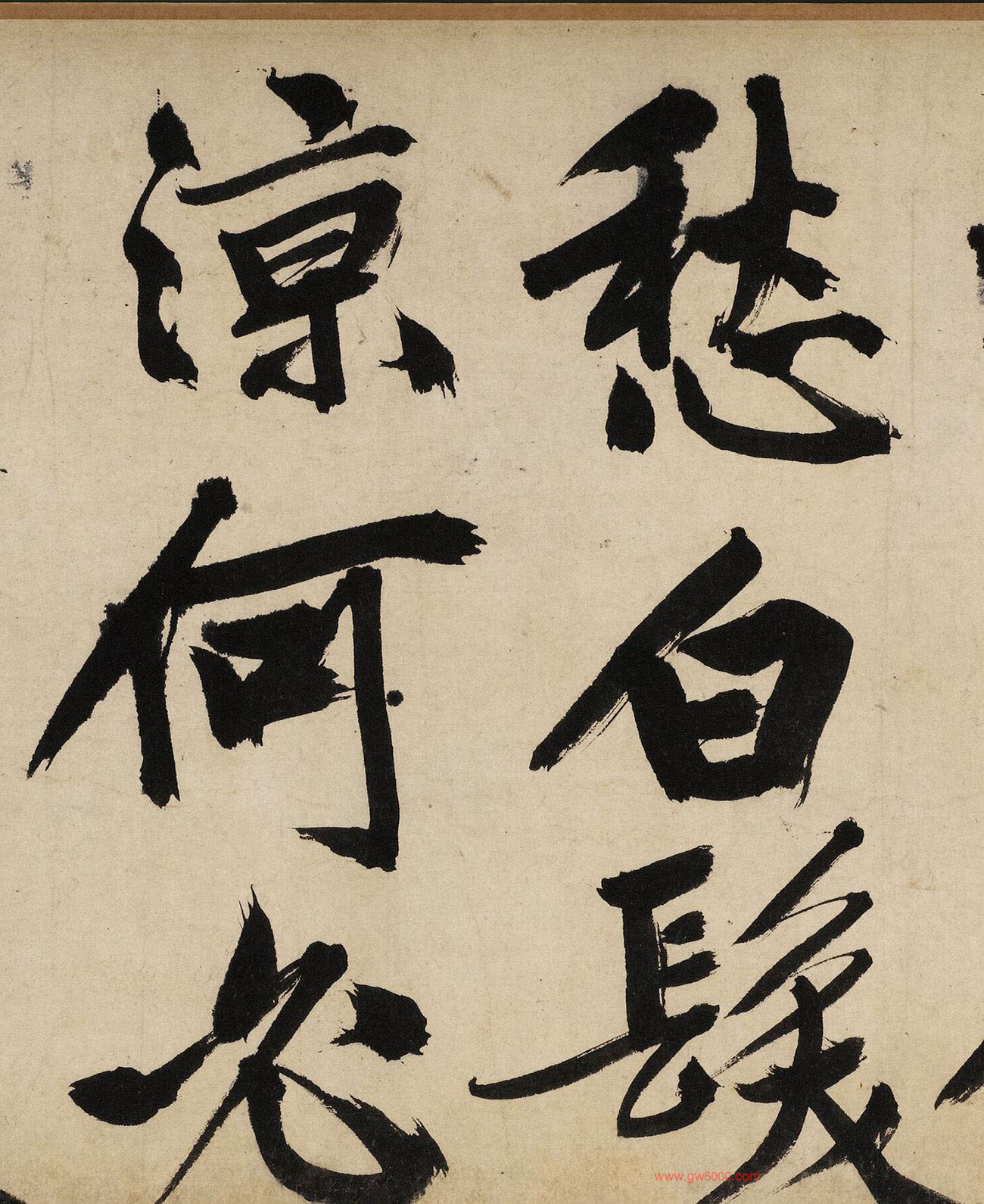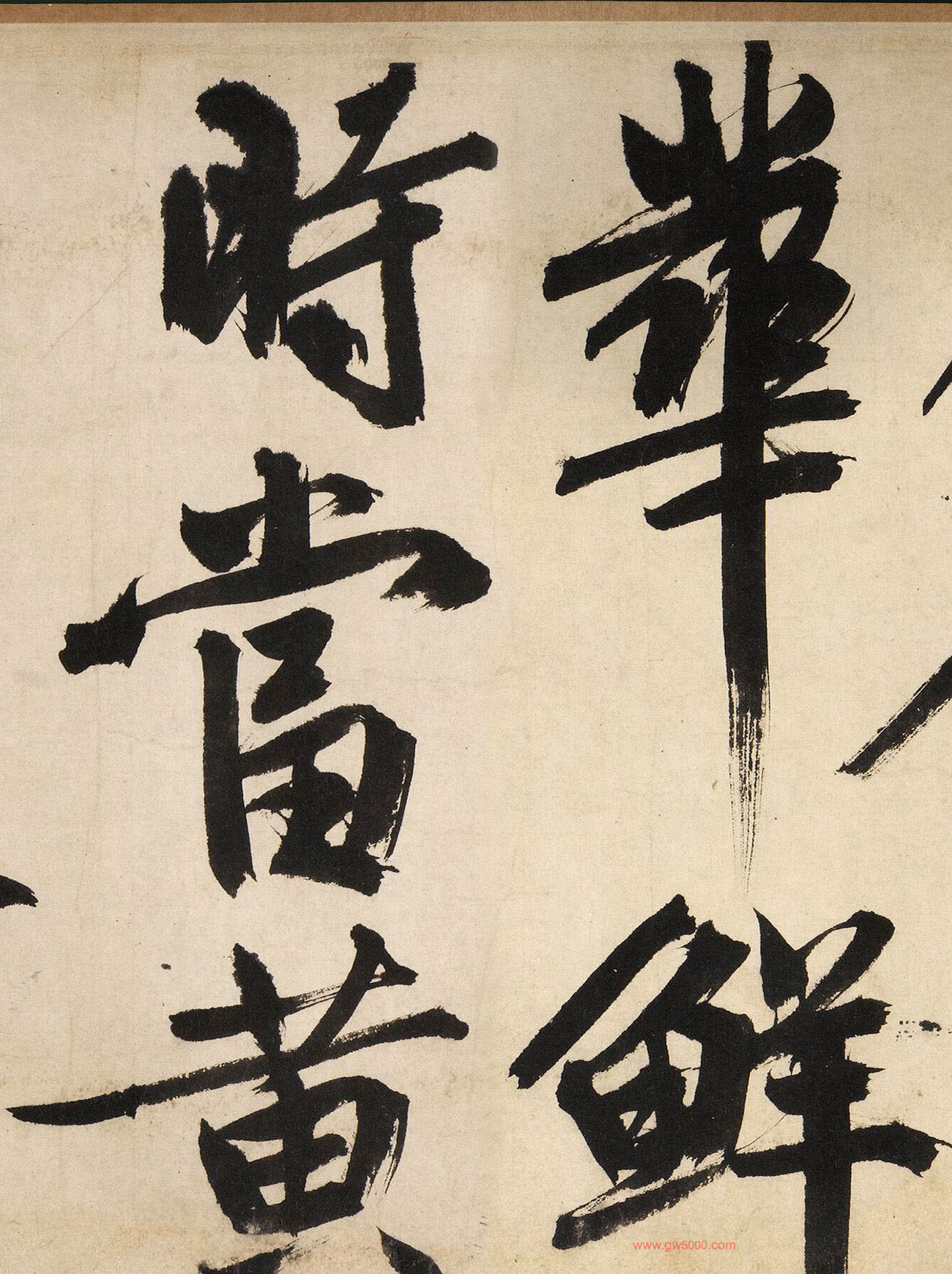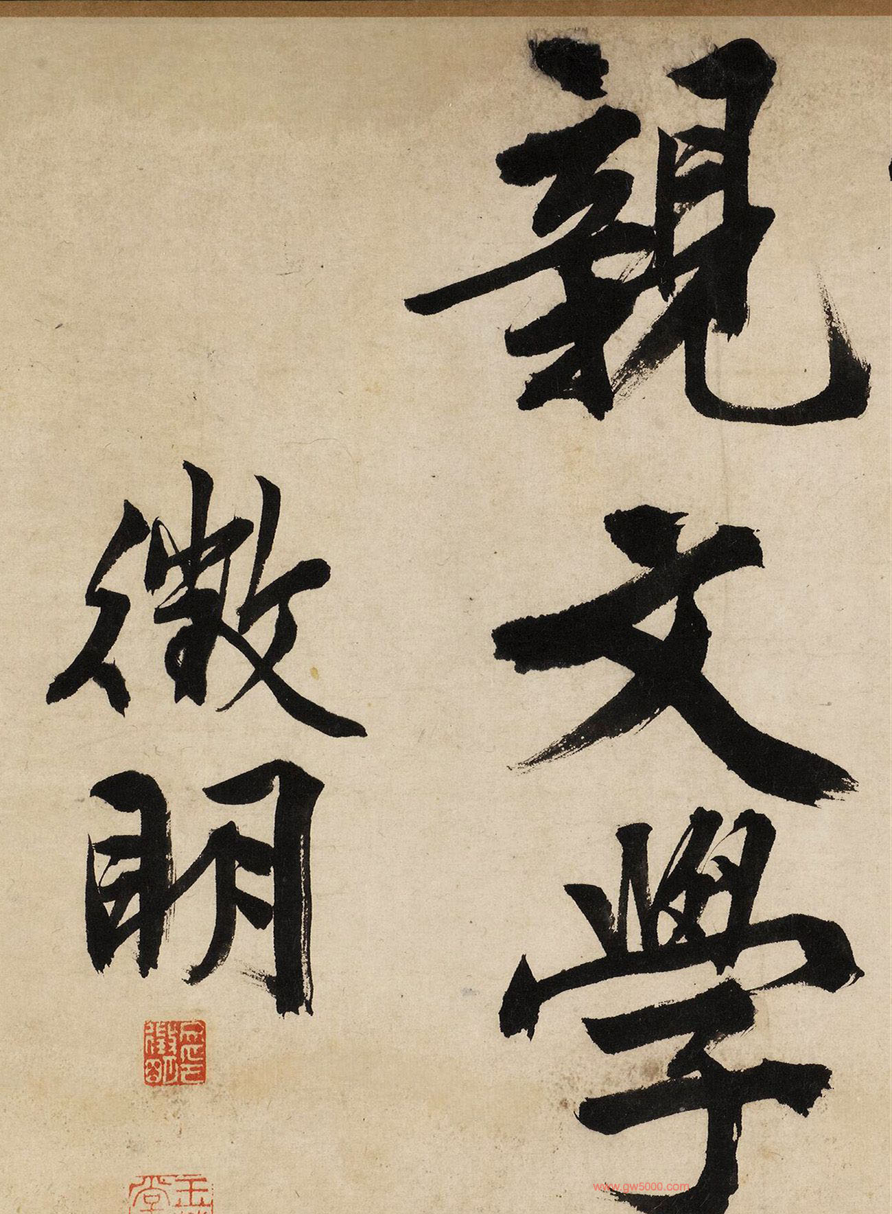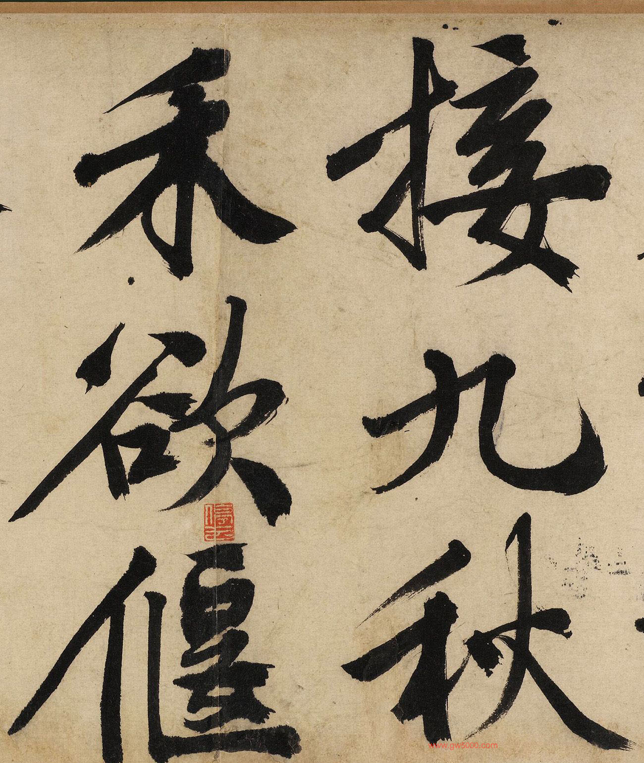 文徵明晚年仿黄庭坚风格的大字作品非常多,均为大字行楷书,时间多在最后十几年之间,且更多一种老辣之气。这幅作品是书写赠给王榖祥的,为文徵明垂老之笔,毫锋散乱,文氏的老态龙钟可以想见。但书写自己的诗作却仍是神采奕奕,结体沉稳,全篇无一懈笔,一片天真烂漫之象。