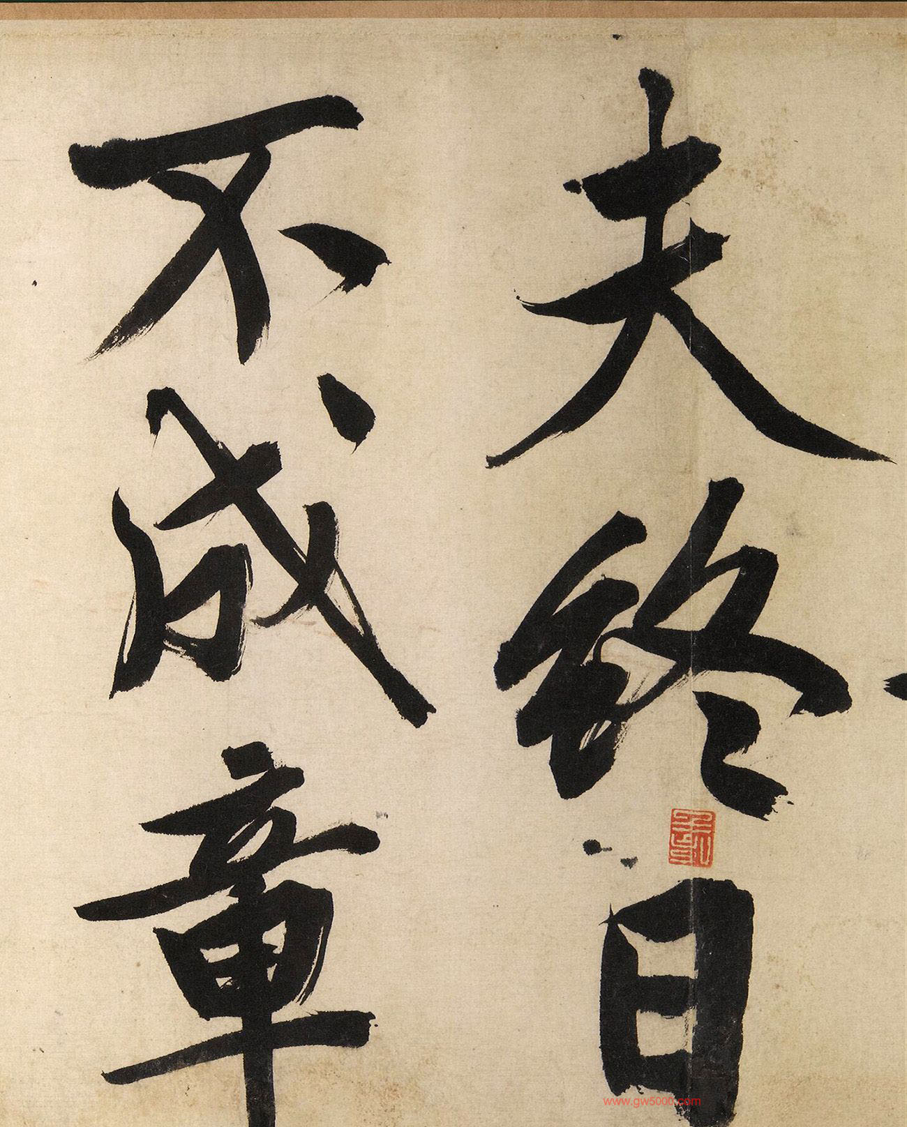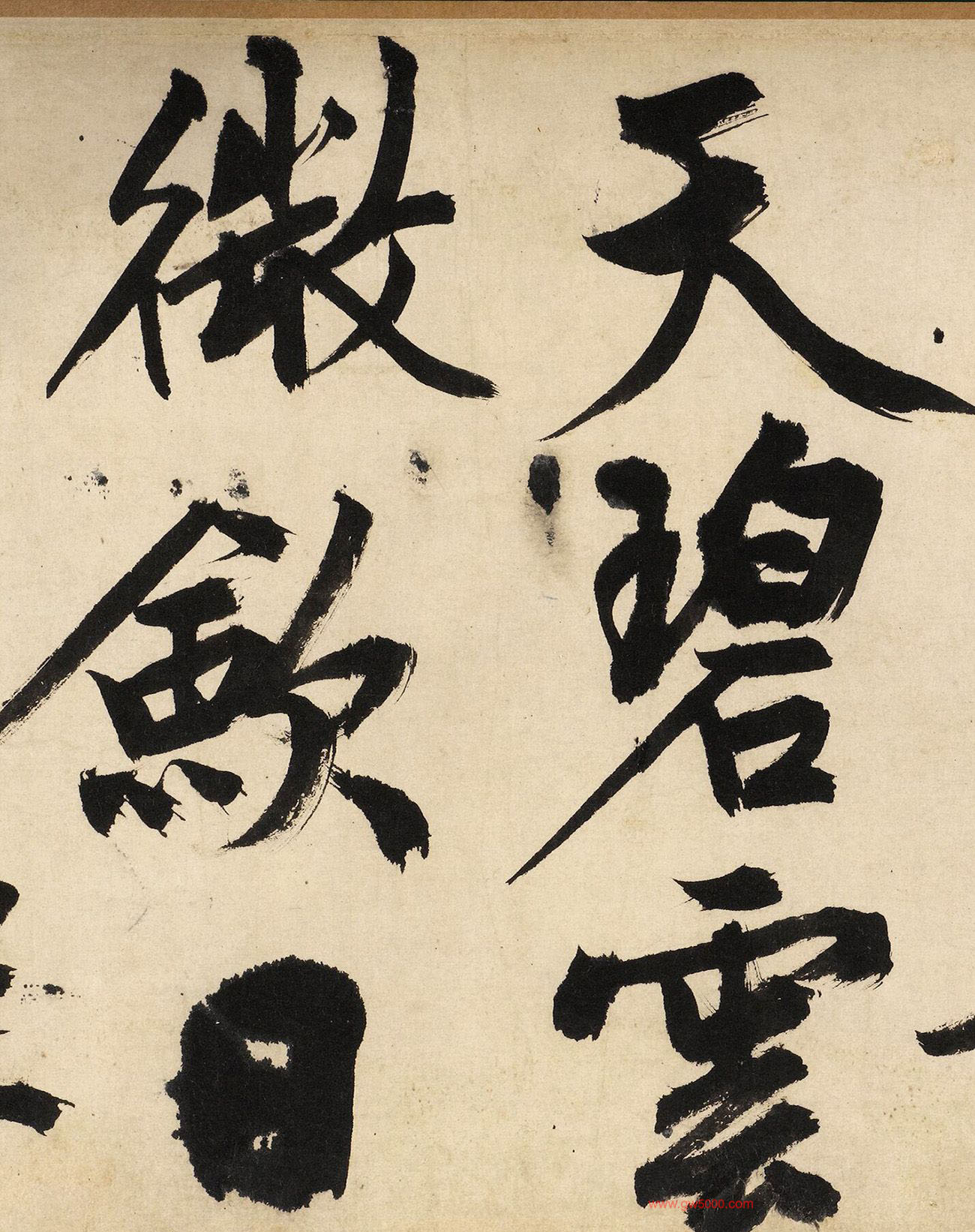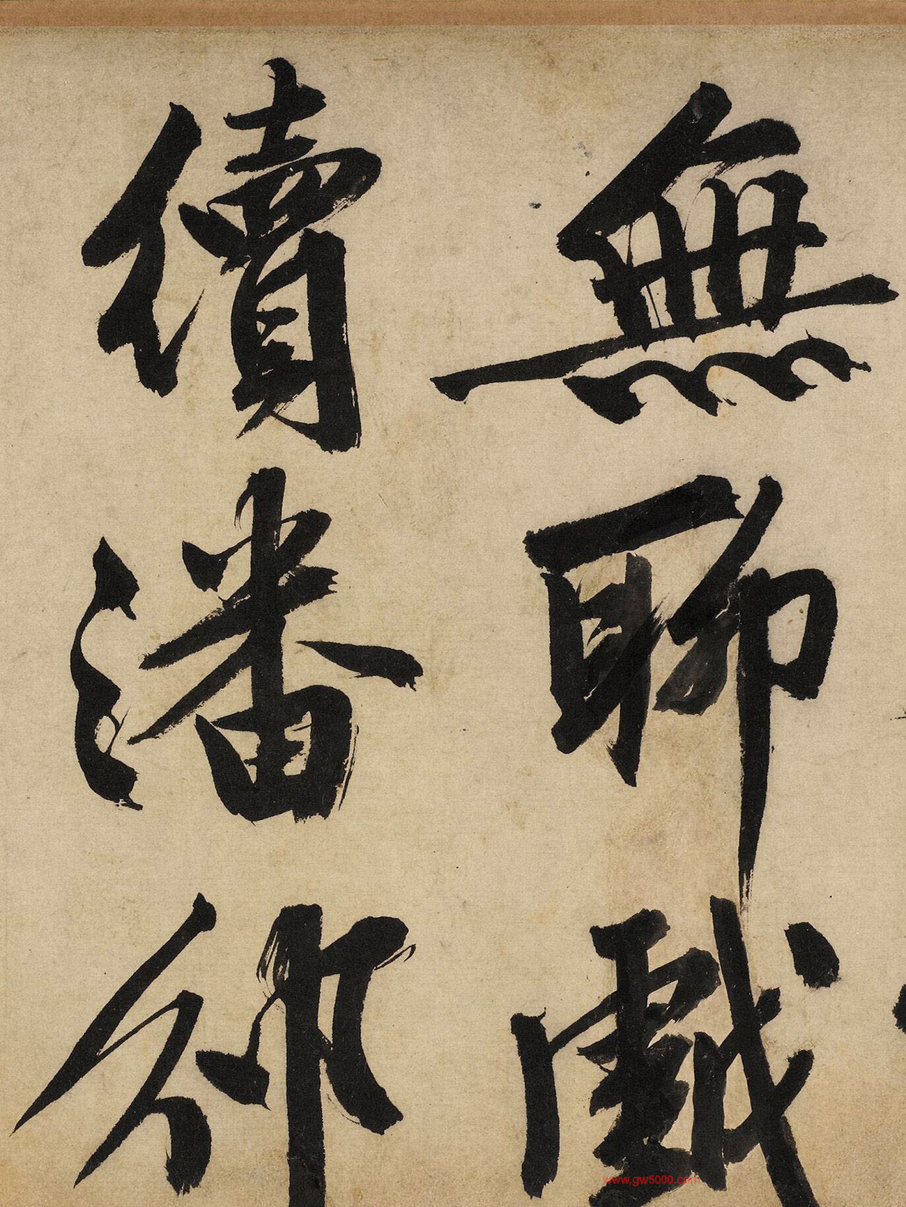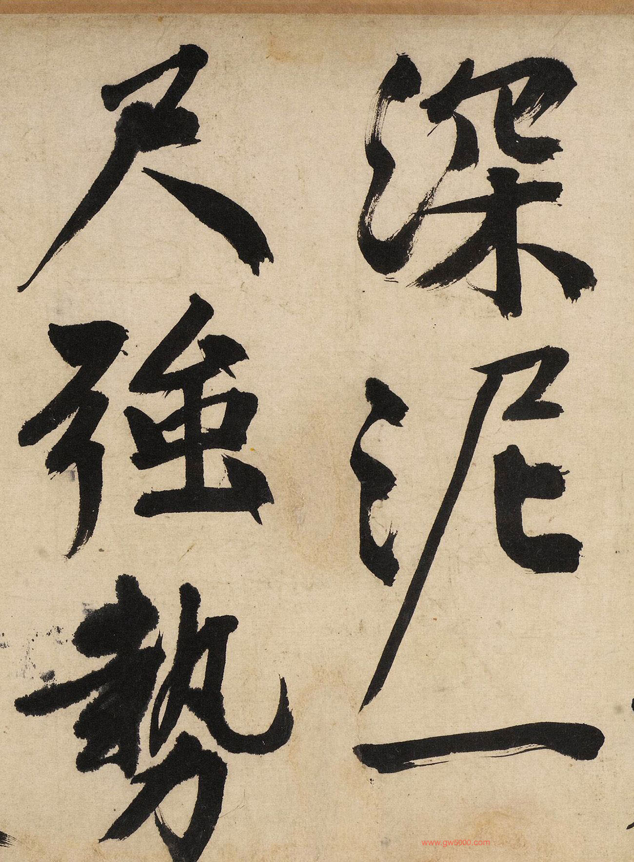 文徵明晚年仿黄庭坚风格的大字作品非常多,均为大字行楷书,时间多在最后十几年之间,且更多一种老辣之气。这幅作品是书写赠给王榖祥的,为文徵明垂老之笔,毫锋散乱,文氏的老态龙钟可以想见。但书写自己的诗作却仍是神采奕奕,结体沉稳,全篇无一懈笔,一片天真烂漫之象。