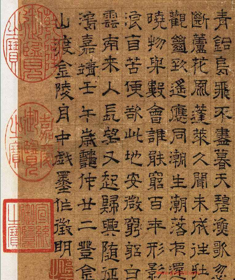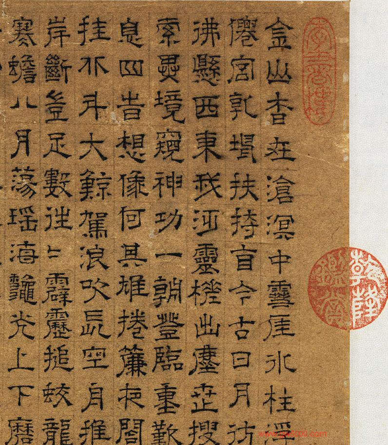 画上隶书题:金山杳在沧溟中。雪厓冰柱浮仙宫。乾坤扶持自今古。日月仿佛悬西东。我泛灵槎出尘世。搜索异境窥神功。一朝登临重叹息。四时想像何其雄。卷帘夜合挂北斗。大鲸驾浪吹长空......舟中戏墨作。徵明