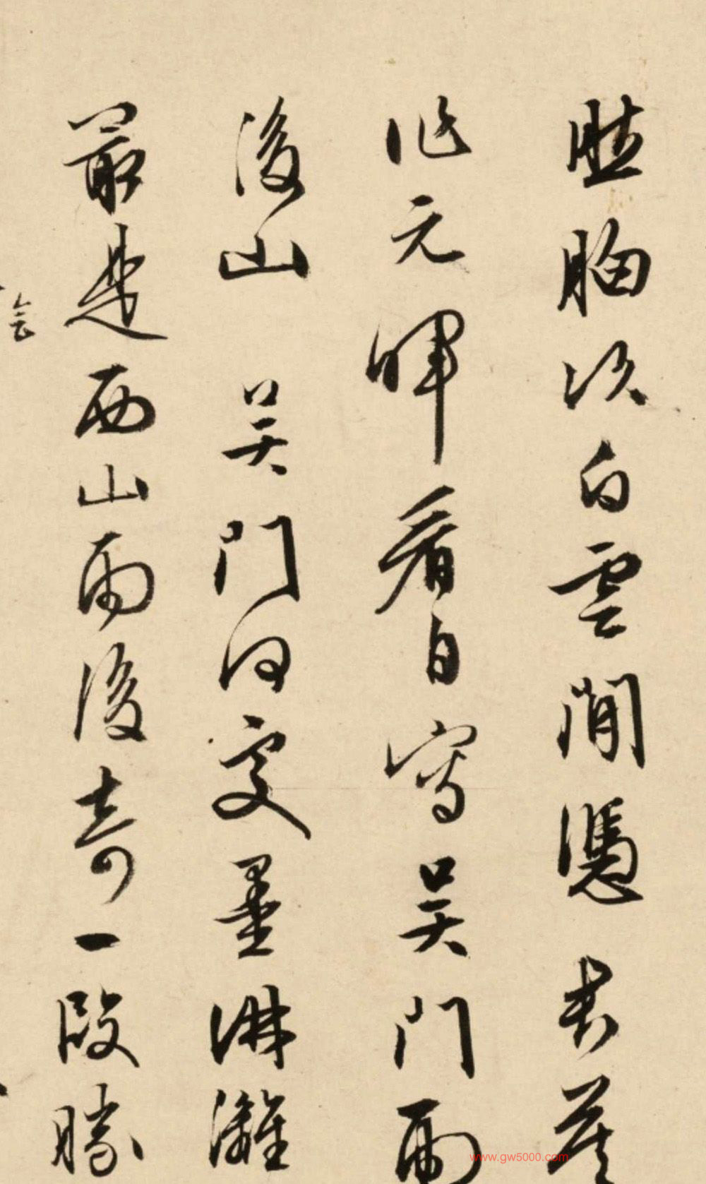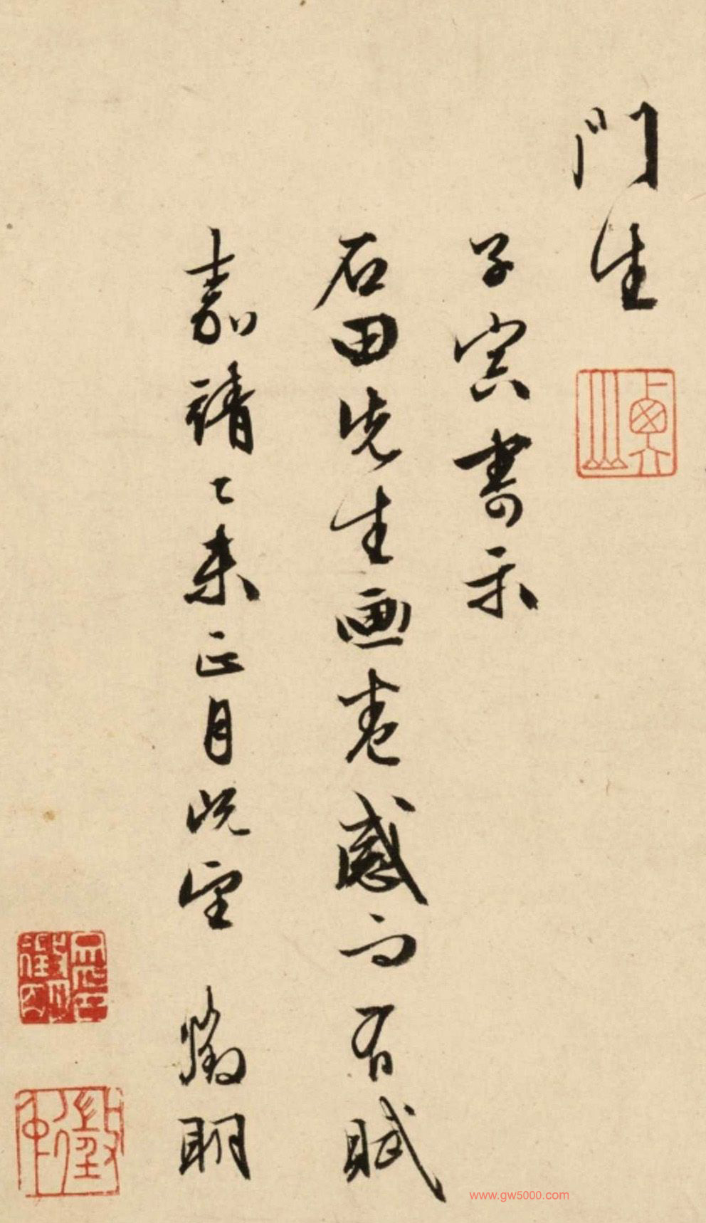 释文:高人不见沈休文,渔子沙头几夕曛。断墨残缣和泪展,碧山千叠锁愁云。石丈高情点笔间,悠然胸次白云闲。凭君莫作元晖看,自写吴门雨后山。吴门何处墨淋漓,最是西山雨后奇。一段胜情谁会得,千年摩诘画中诗。当年诗律号精成,老去还怜画掩名。世论悠悠遗钵在,白头惭媿老门生。 子寅寄示石田先生画卷,感而有赋。嘉靖乙未正月既望,徵明。
