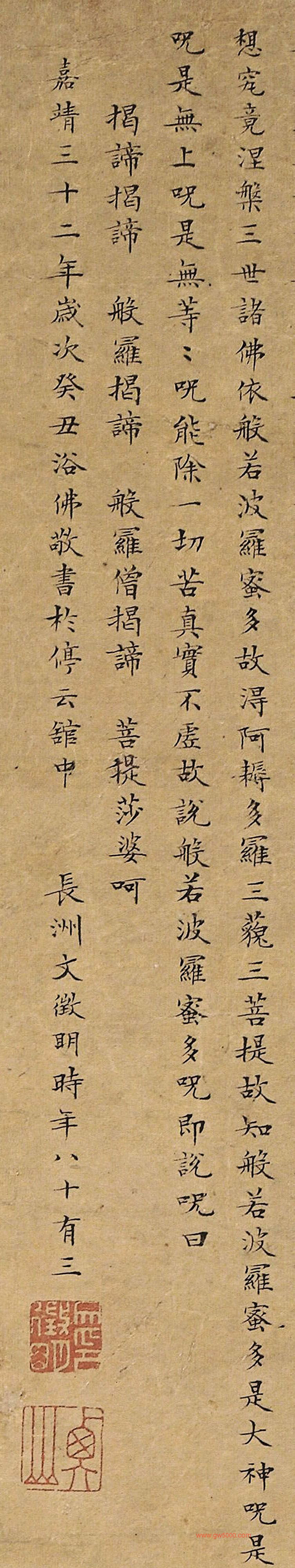 嘉靖三十二年岁次癸丑浴佛敬书于停云馆中,长洲文徵明时年八十有三。
