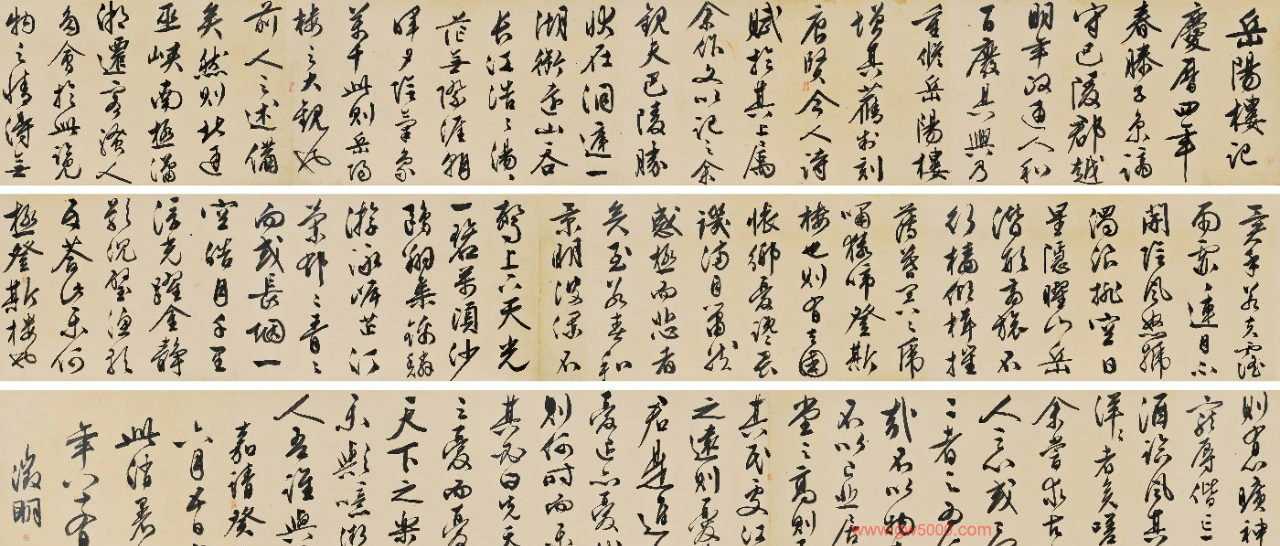 文徵明行书岳阳楼记,手卷纸本,47.5×972 cm,王鸿绪旧藏。来源:北京保利2021春拍。