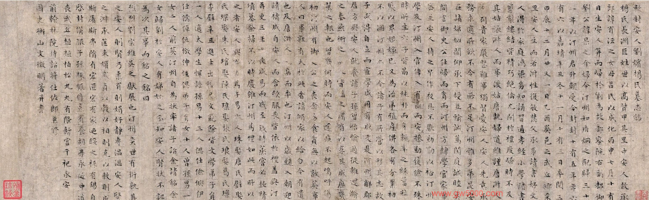 识文: 敕封安人刘嫔杨氏墓志铭。杨氏长洲臣巨姓,世以高赀甲其里中。安人故承事郎讳有沄之女,母吕氏以成化丙申七月……胡弗永延,中道而丧,武丘桓桓,柏松丸丸,有隆新官,千祀永安。