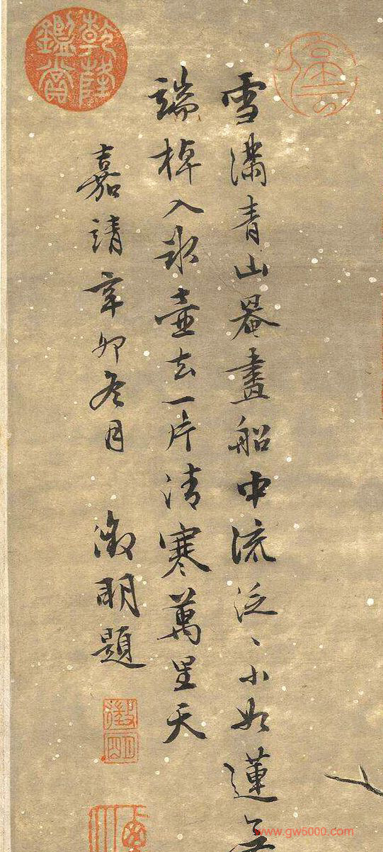 雪满青山罨画船,中流泛泛小如莲。无端棹入冰壶去,一片清寒万里天。嘉靖辛卯(1531年)冬月。徵明题。