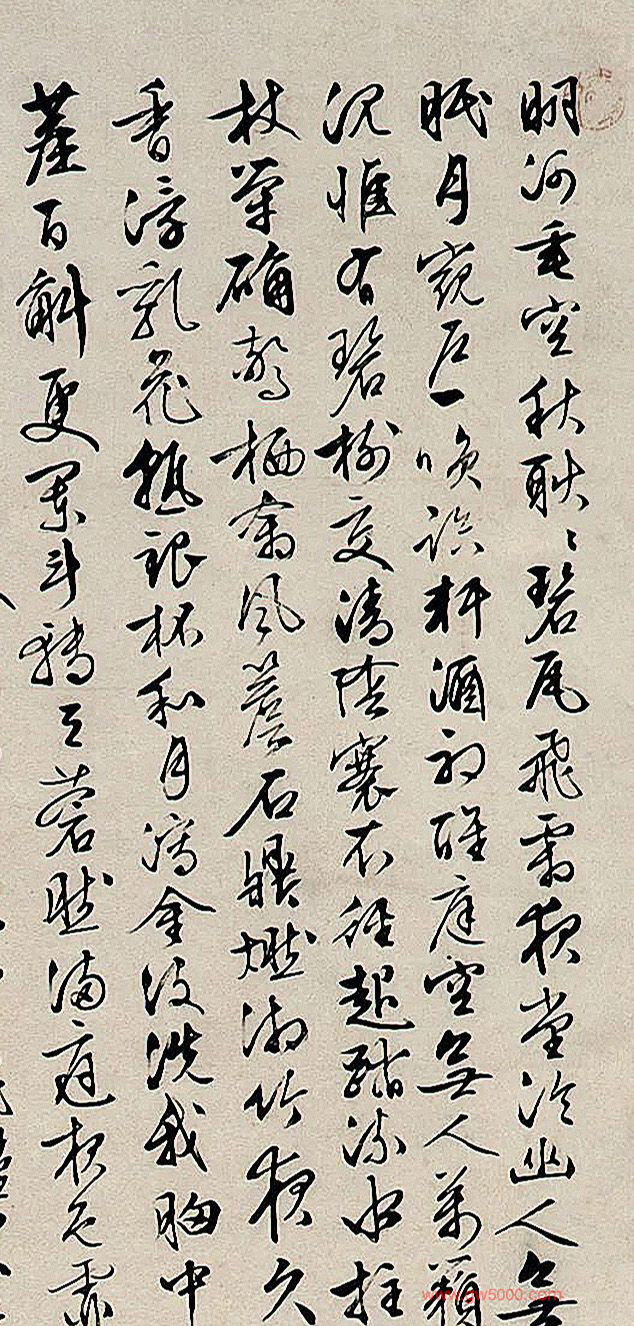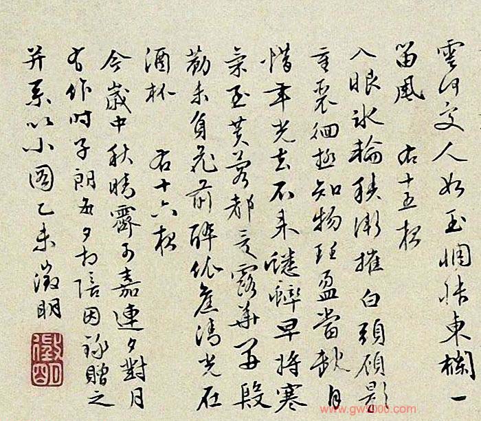 自题:明河垂空秋耿耿,碧瓦飞霜夜堂冷。幽人无眠月窥户,一笑临轩酒初醒。庭空无人万籁沉,惟有碧树交清阴。褰衣径起踏流水,拄杖荦确惊栖禽。风檐石鼎燃湘竹,夜久香浮乳花熟。银杯和月泻金波,洗我胸中尘百斛。更阑斗转天苍然,满庭夜色霏寒烟。蓬莱何处亿万里,紫云飞堕阑干前。何人为笑李谪仙,明月万古人千年。人千年,月犹昔,赏心且对樽前客,但得常闲似此时,不愁明月无今夕。十月十三夜,与客小醉,起步中庭,月色如昼。时碧桐萧疏,流影在地,人境俱寂,顾视欣然,因命僮子烹苦茗啜之,还坐风檐,不觉至丙夜。东坡云:何夕无月,何处无竹柏影,但无我辈闲适耳。嘉靖壬辰徵明识。