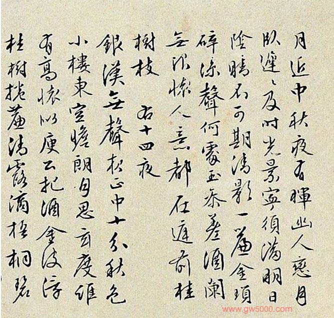 释文:月近中秋夜有晖,幽人恋月卧迟迟。及时光景宁须满,明日阴晴不可期。清影一帘金琐碎,流声何处玉参差。酒阑无限怀人意,都在庭前桂树枝。右十四夜。