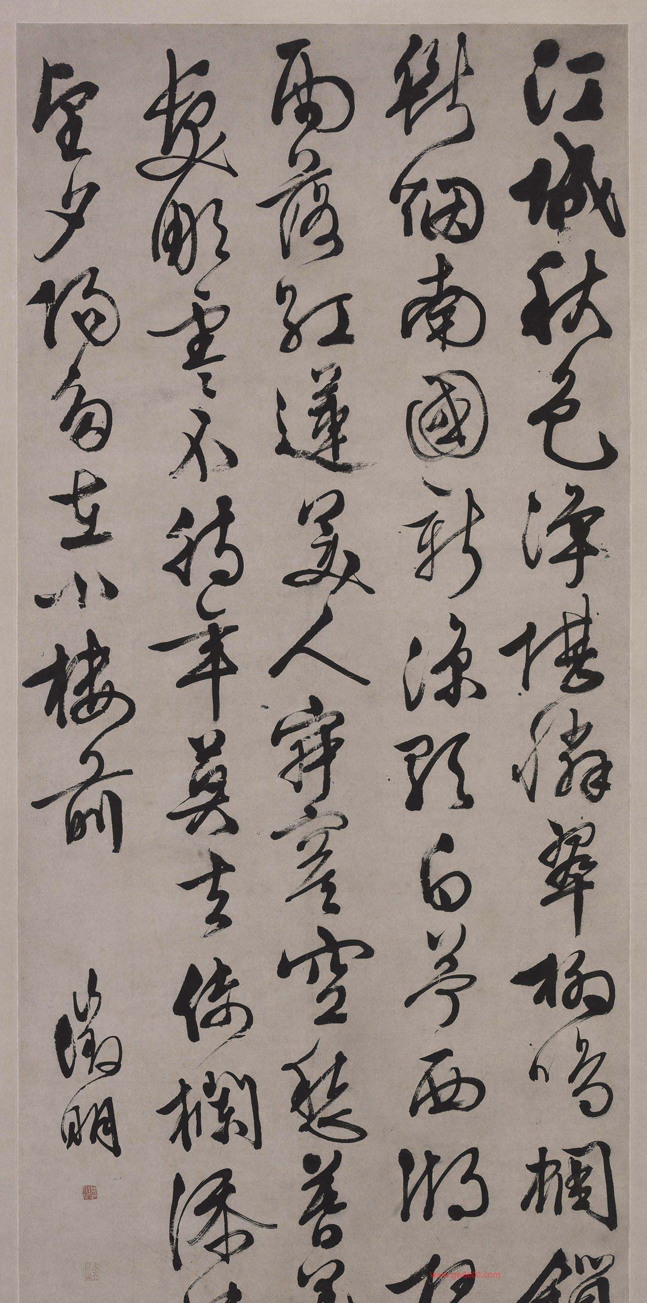 释文:江城秋色净堪怜,翠柳鸣蜩锁断烟。南国新凉歌白苎,西湖夜雨落红莲。美人寂寞空愁暮,华发凋零不待年。莫去倚栏添怅望,夕阳多在小楼前。徵明。