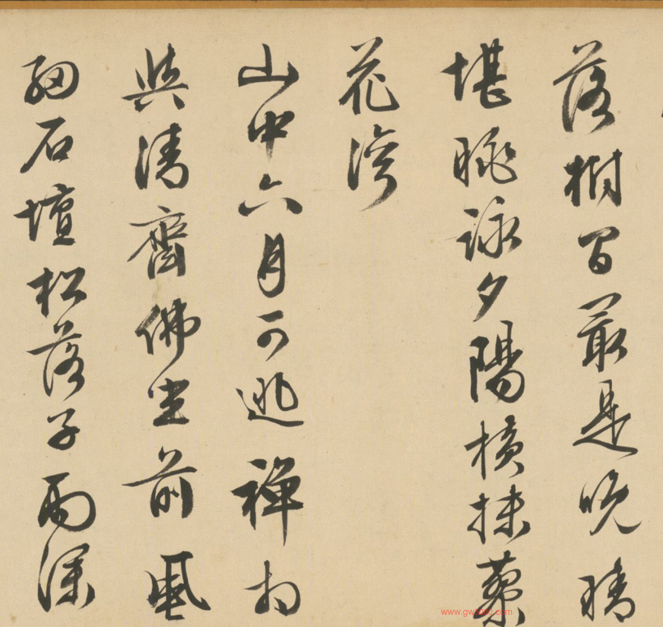 山中六月可逃禅,相与清斋佛座前。风细石坛松落子,雨深沙窦竹垂鞭。别来光景浑依旧,壁上题名不记年。底用忘归归自好,晚霞新月载溪船。