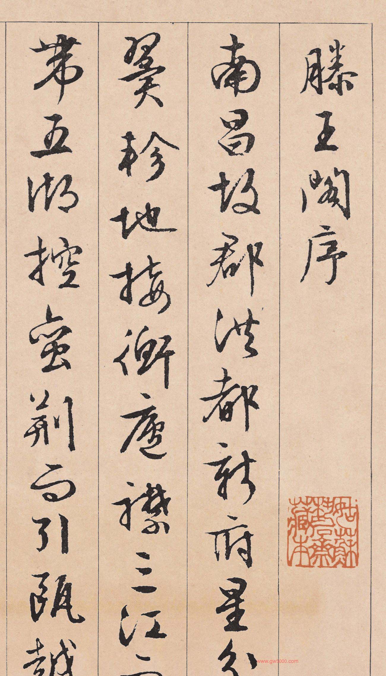 《滕王阁序》为唐代诗人王勃所作,明代书画家文徵明撰写,文氏行草书法,平正婉和,温润秀劲,笔势潇洒,清秀俊雅。文氏行草书法有王羲之、智永等人风格,又吸取宋元书法家苏轼、米芾、黄庭坚的精华,形成其独特风格。