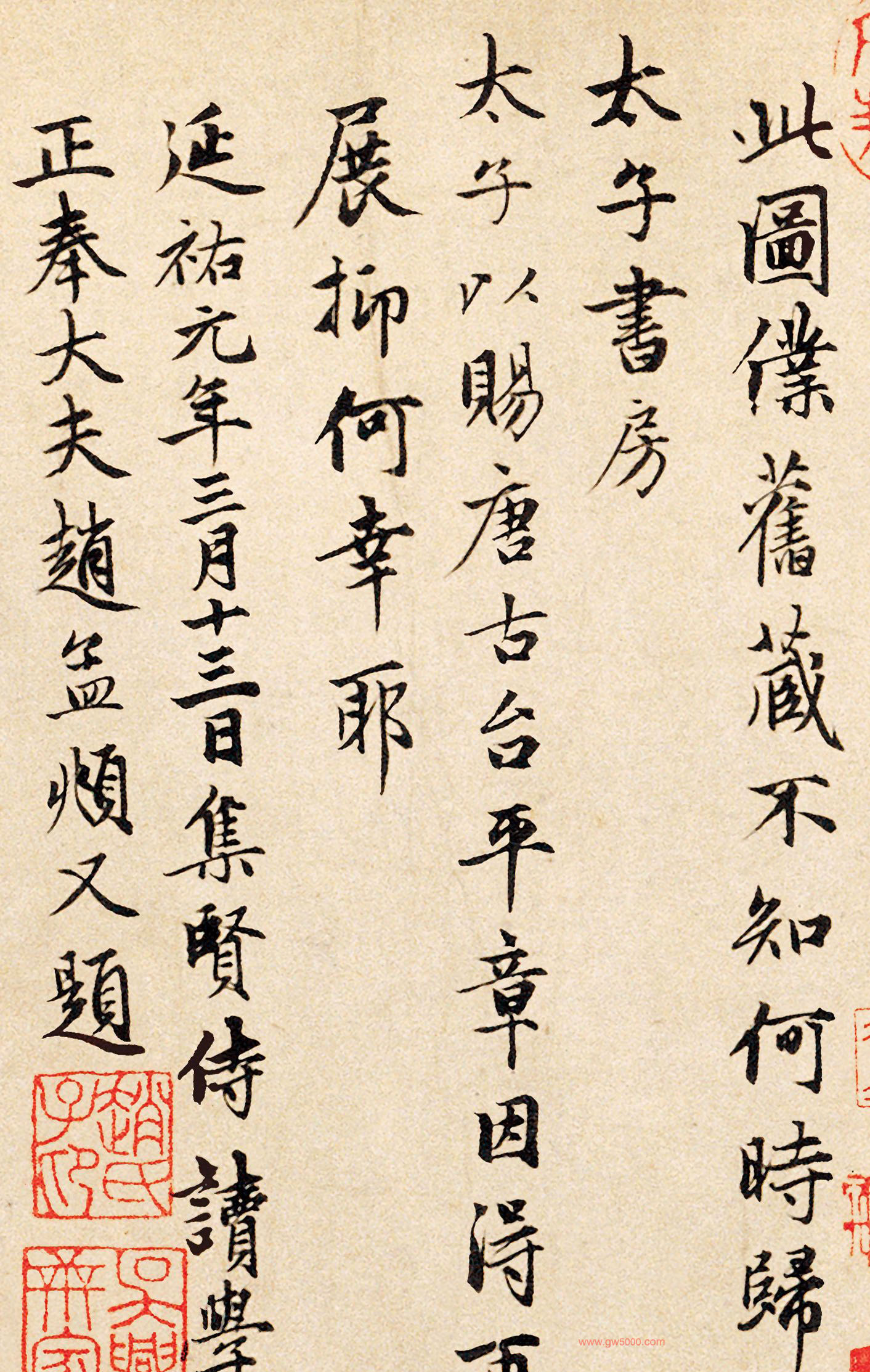 此图仆旧藏,不知何时归太子书房,太子以赐唐古台平章,因得再展,抑何幸耶!延祐元年三月十三日,集贤侍读学士正奉大夫赵孟頫又题。