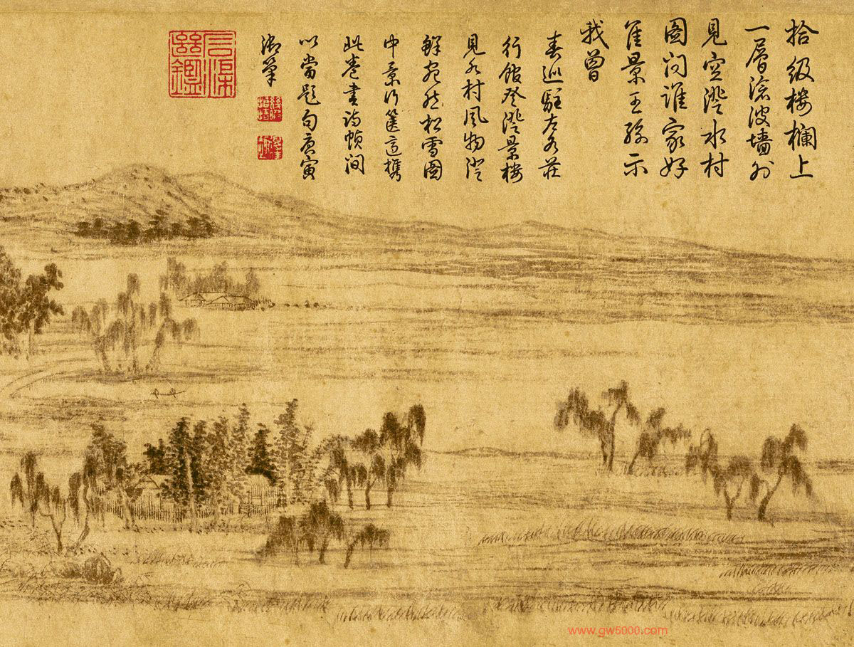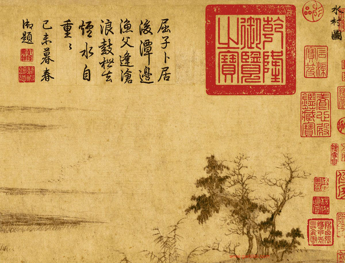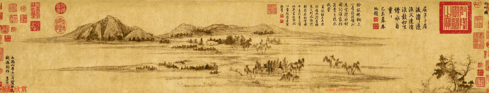 元代赵孟頫字画欣赏《水村图卷》纸本,纵24.9cm,横120.5cm。故宫博物院藏。