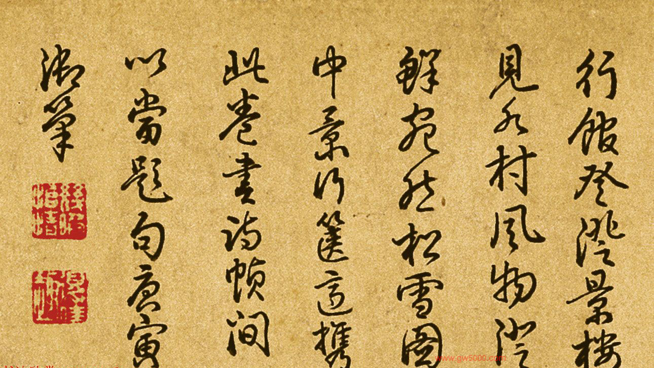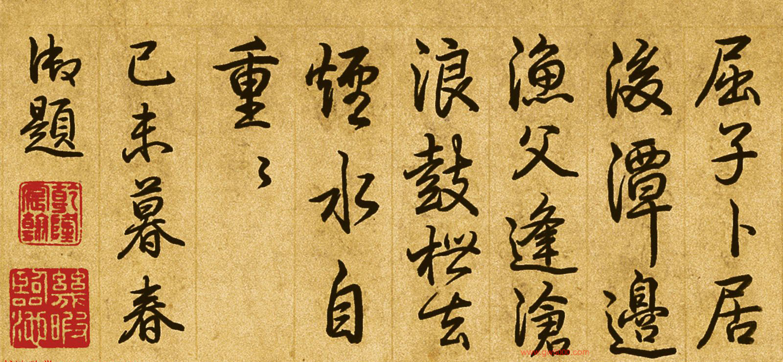 此图卷作于元大德六年(1302年),赵孟頫时年49岁。赵孟頫以水墨写江南水乡平远开阔的景色,从用笔到构图都受到董源的影响,但董源的画法已完全融入赵孟頫的个人风格之中,于不经意间表现出来。山用披麻皴画出,景物以平远的形式展开。渴笔较多,用笔松秀含蓄,"写"的意味较浓,体现了书法的审美趣味。