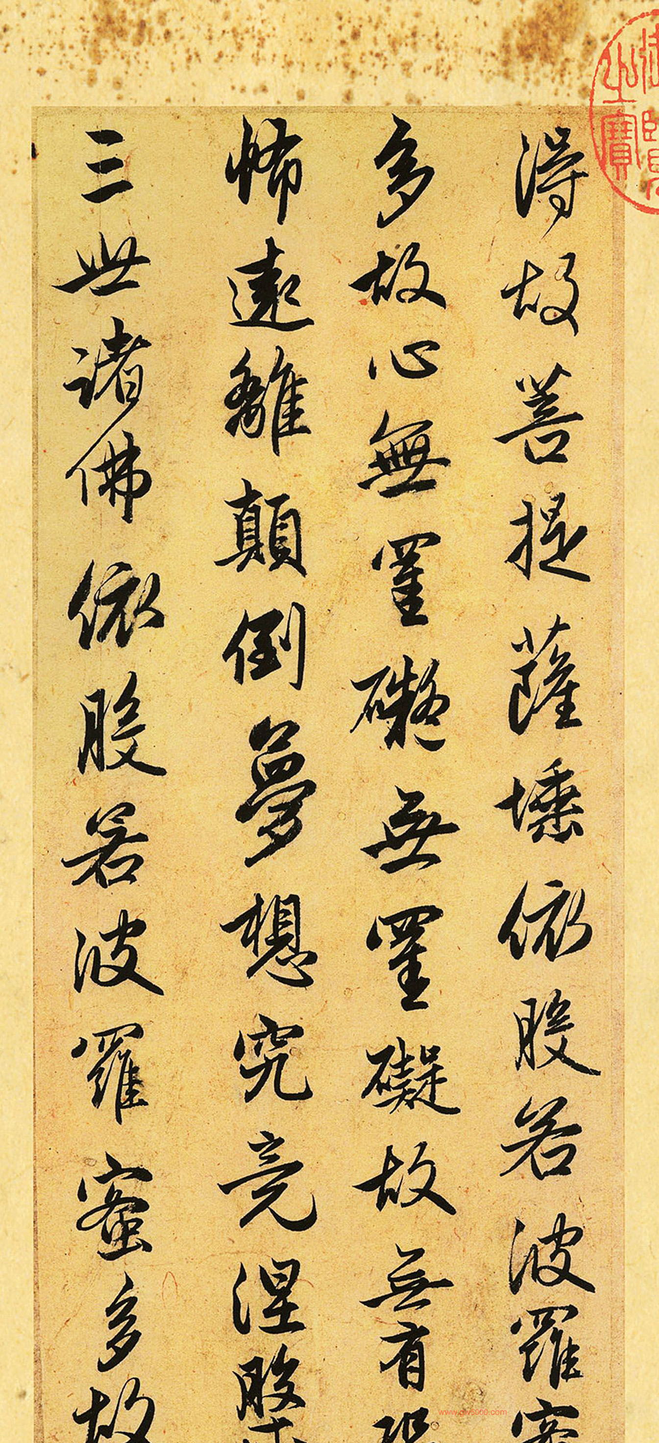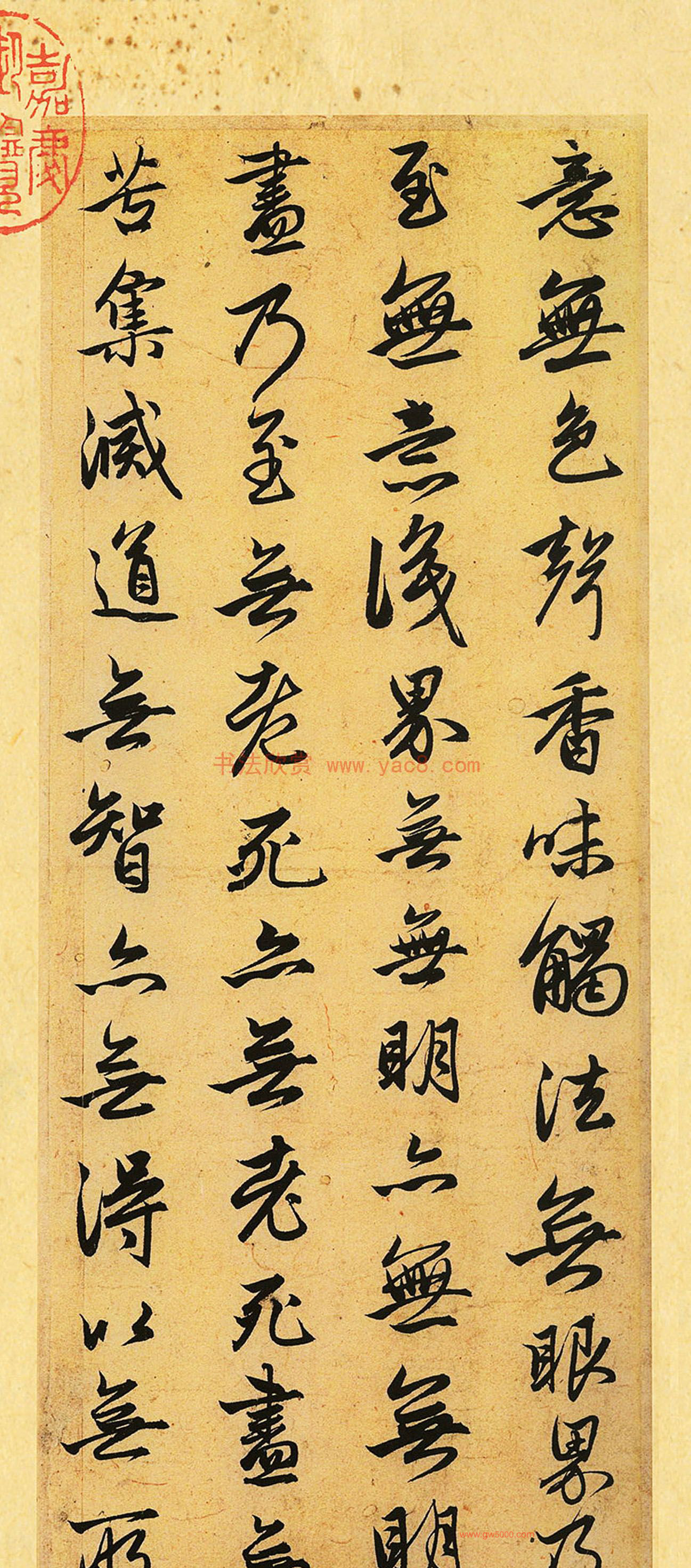 赵孟頫代表作品《赵松雪书心经》册页装,纸本3开。每单开纵288厘米,横108厘米。原为清张若蔼旧藏,《心经》原为手卷,入清宫后改为册页,现藏辽宁博物馆。