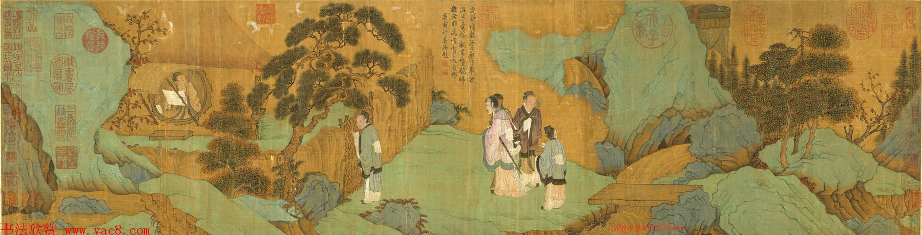 本幅山石無皴,僅鉤勒輪廓,後填以青綠,人物衣紋行筆柔暢有力,有唐人古風。