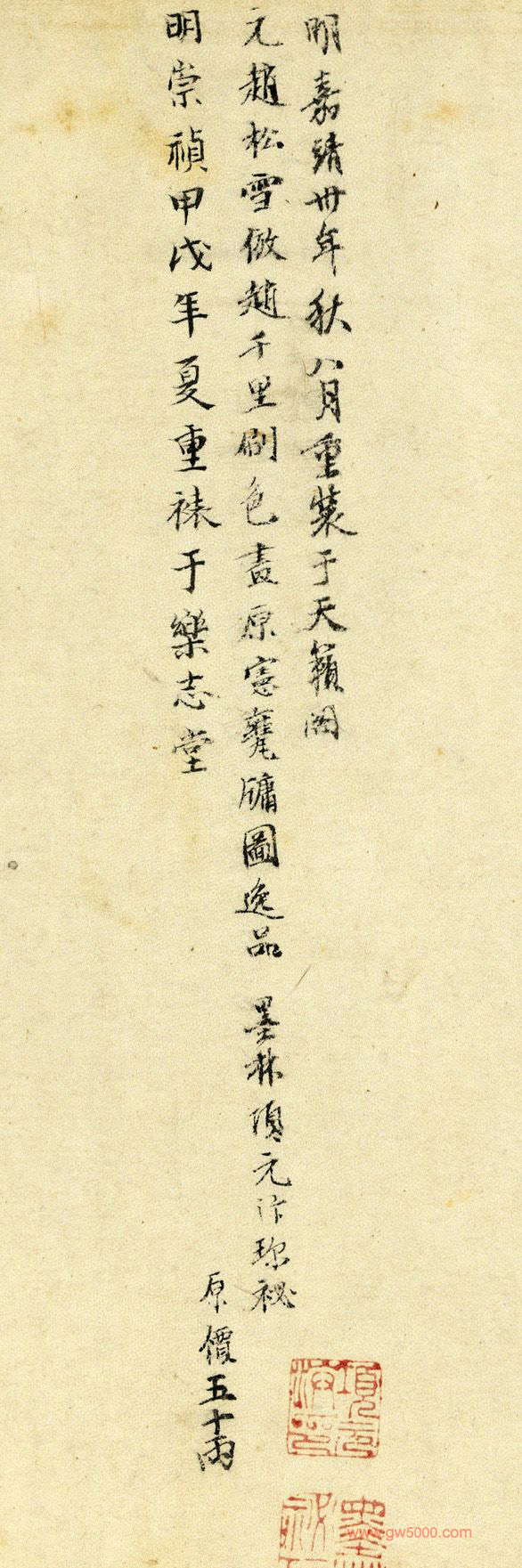 畫幅右下有千字文「索」字編號,卷後則有項元汴題識「明嘉靖卅年(1558)秋八月重裝于天籟閣」,並有「原價五十兩」之記述。