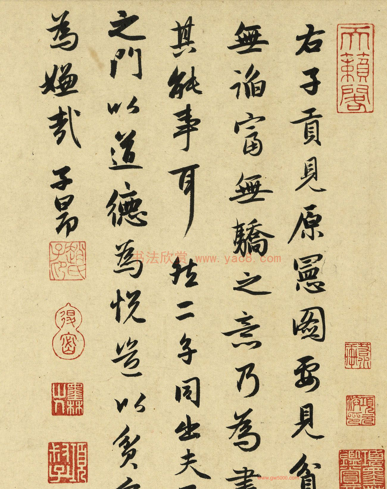 趙孟頫書畫復唐宋古風,為後世所宗。圖繪子貢見原憲於其居所,桑木為門軸,破甕為窗口之陋室,以昭示君子以德樂道之理,故事出於《史記·仲尼弟子列傳》。端木賜,字子貢,衛人。少孔子三十一歲,經商相魯致富。原憲,宋人,少孔子二十六歲,樂道隱居而貧。