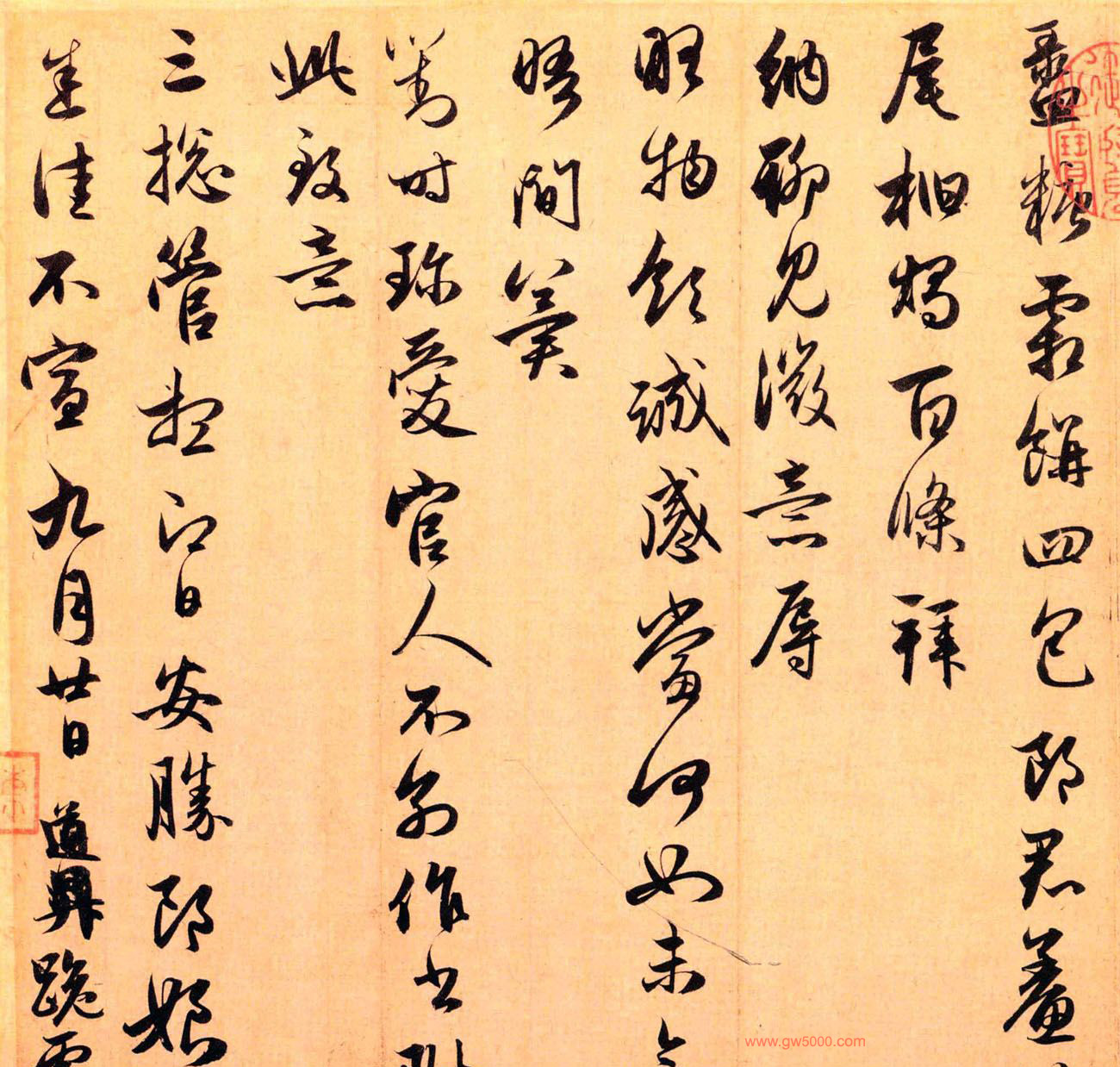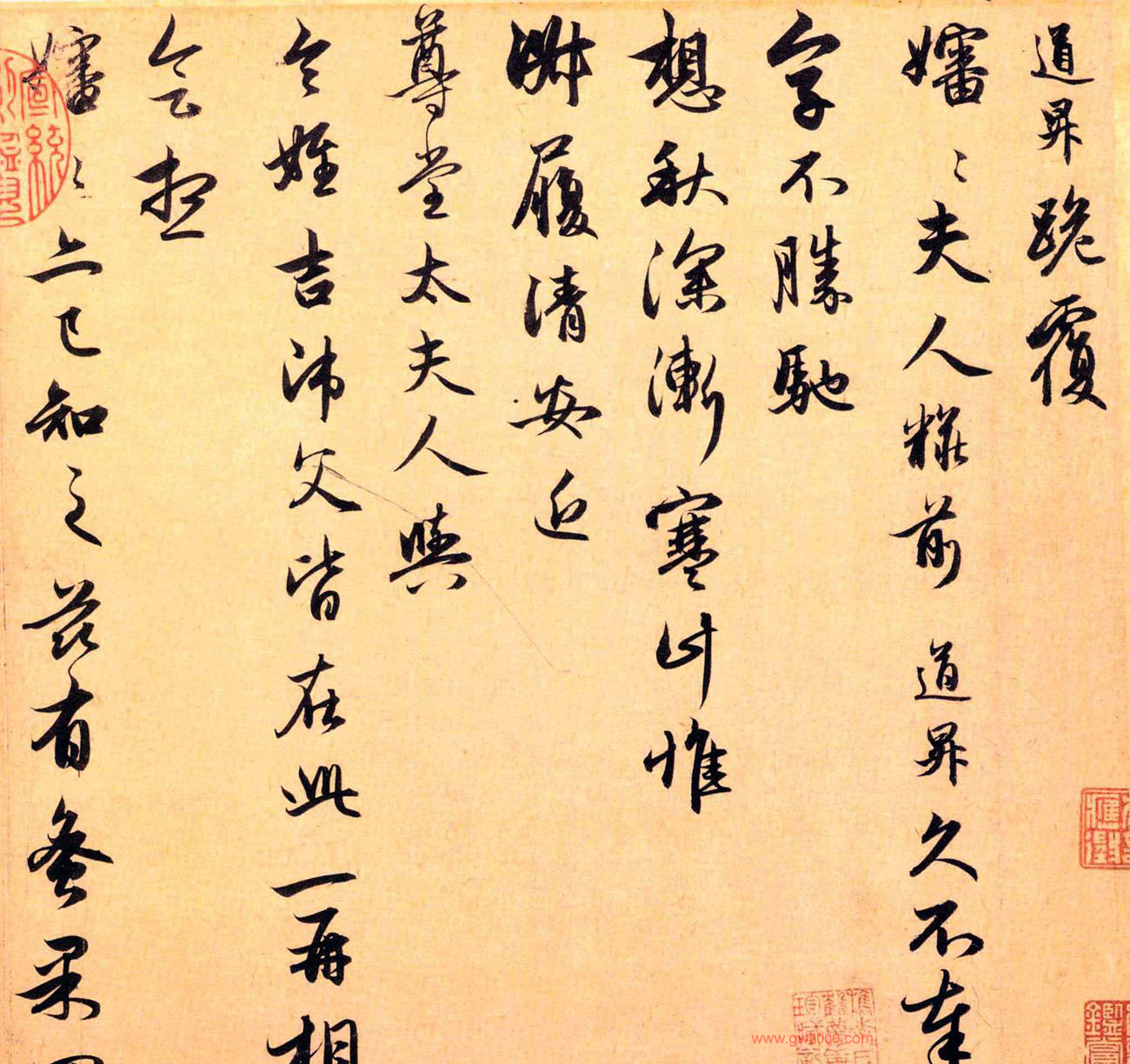 这是管道昇给婶婶的问安、馈赠的家信,实为赵孟頫所书。赵氏信笔写来一时忘情,末款署了自己的名,发觉后忙又改过,现在还可以看出涂改之迹。