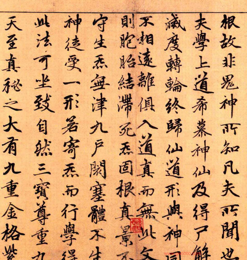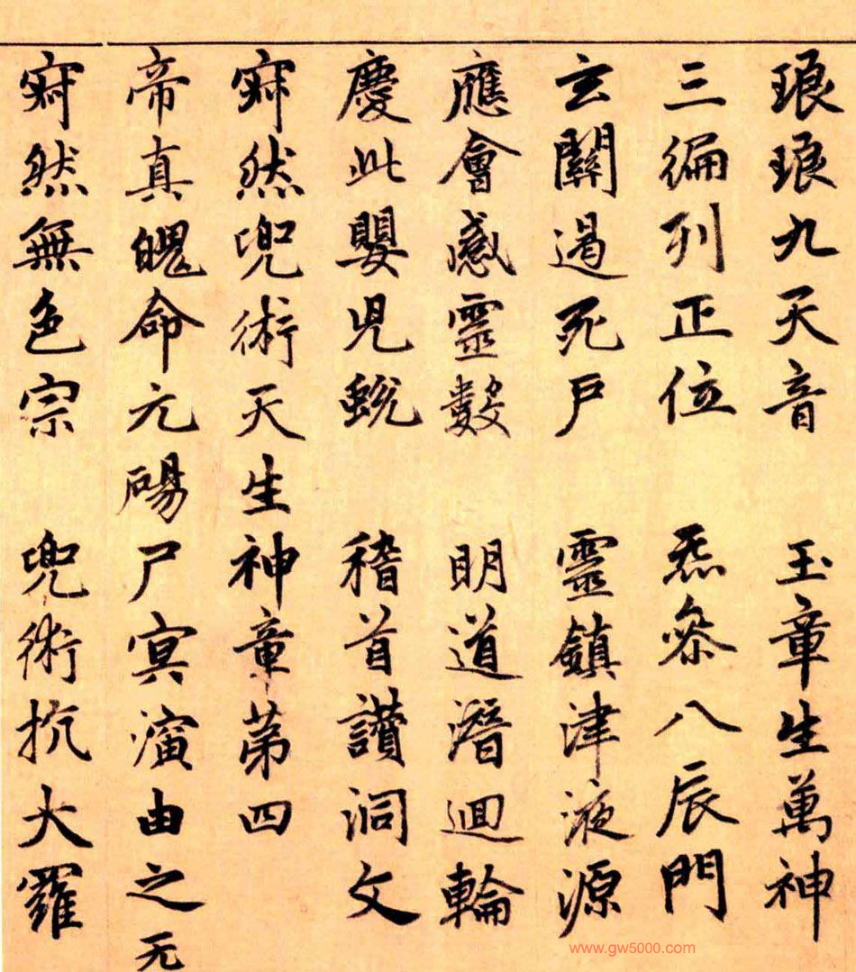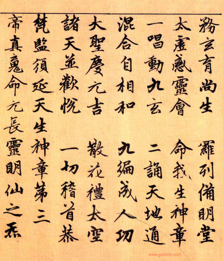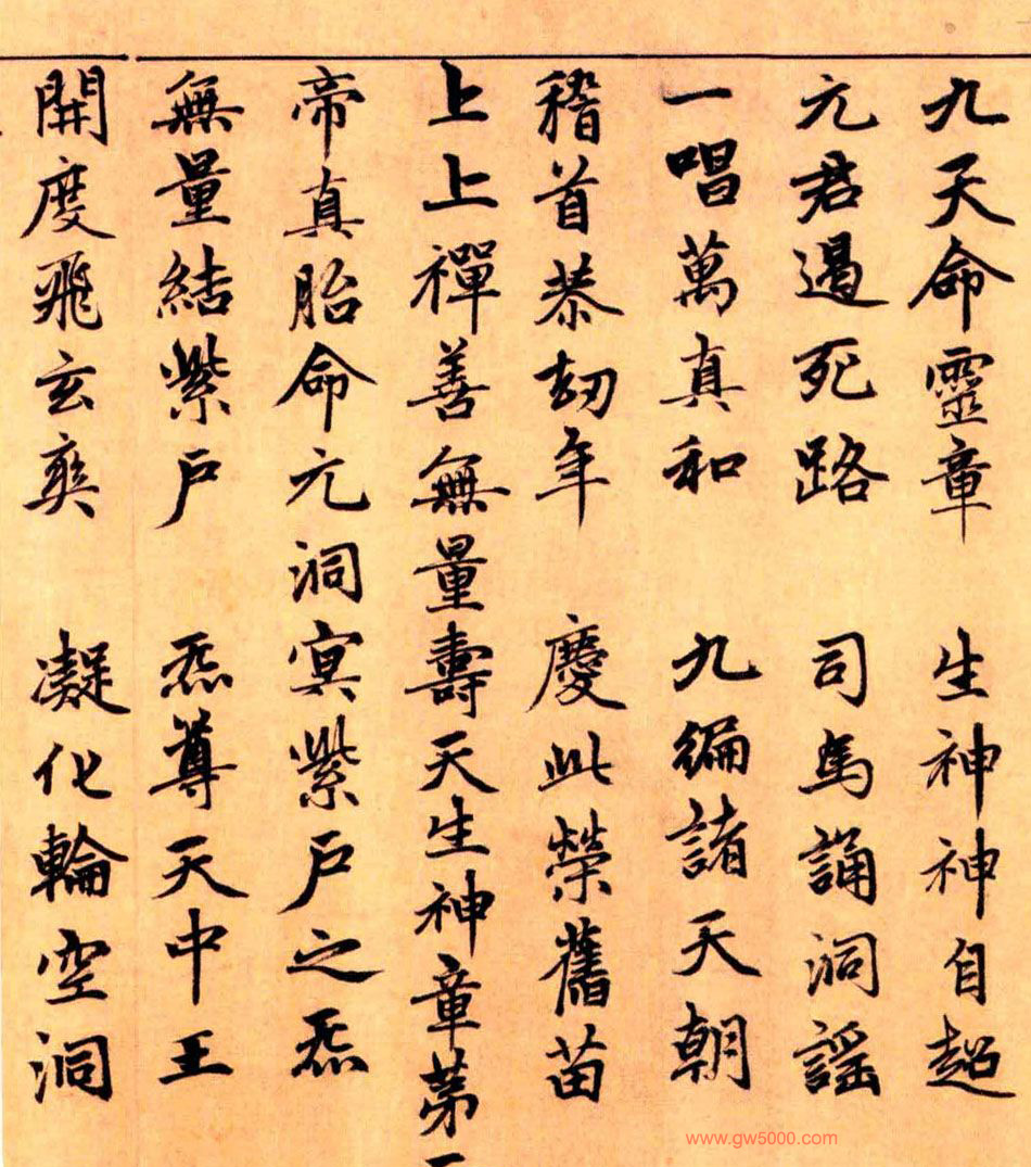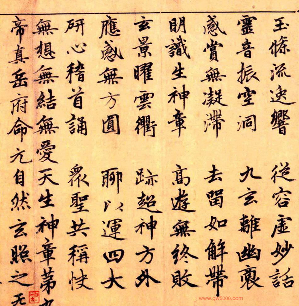 《洞玄灵宝自然九天生神章经》,简称《生神章》,是道教较早的重要经典之一,撰文者不详(约出于东晋)。此卷是辞官归湖州后的赵孟頫,应弟子张雨之请为钱塘隐真庵主何道坚所书,此为存世赵书中少见的长篇巨制,全文五千馀言,书法行笔流畅,字体端庄大方,首尾如一,极见功力。