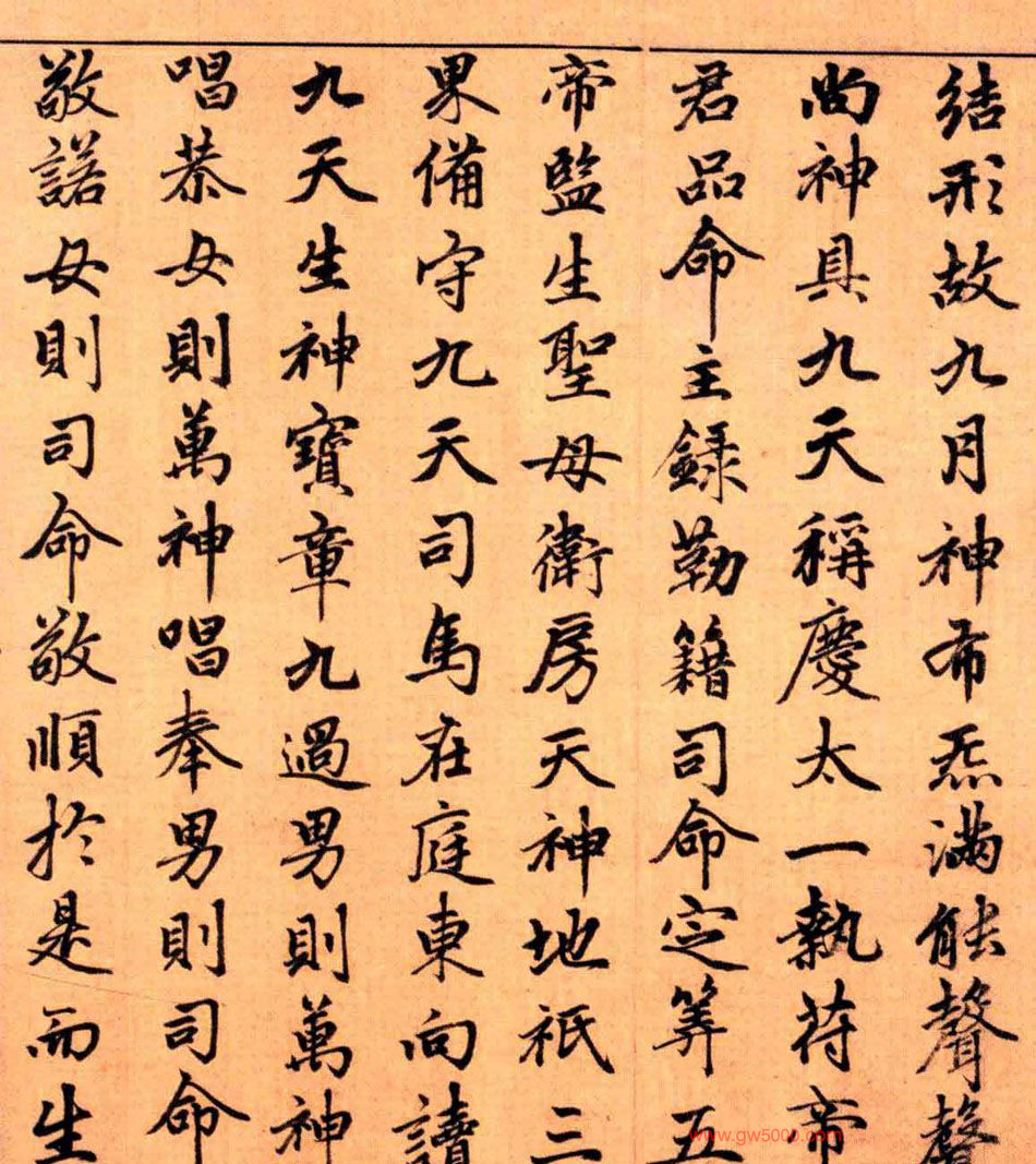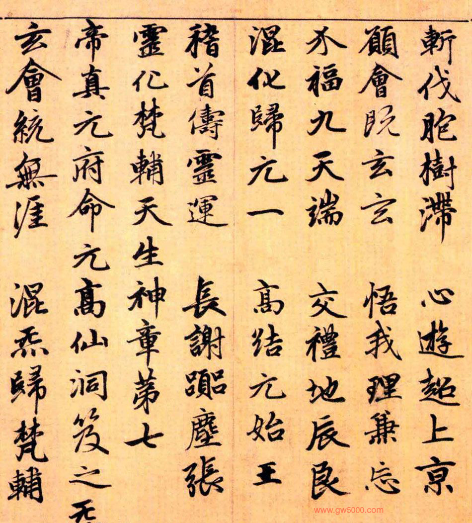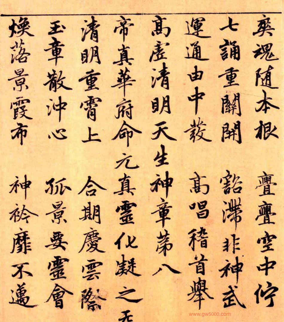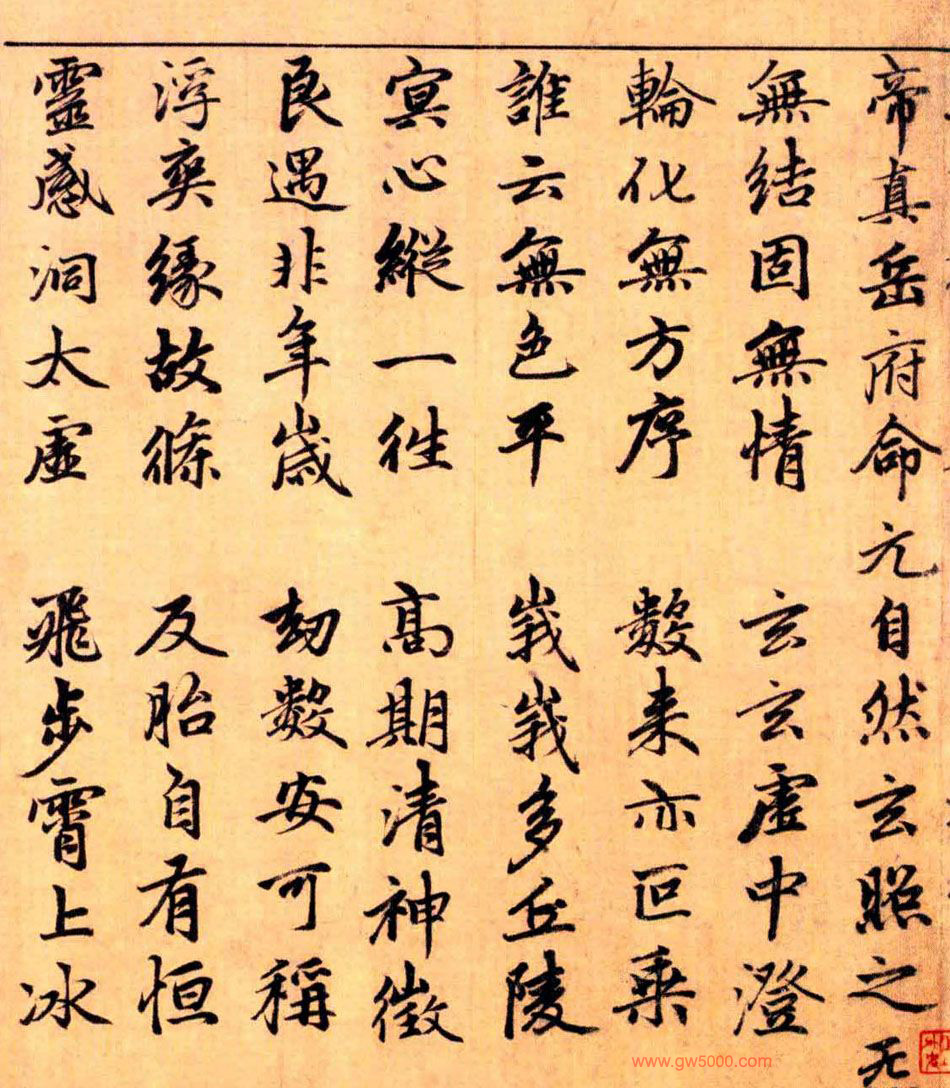 《洞玄灵宝自然九天生神章经》,简称《生神章》,是道教较早的重要经典之一,撰文者不详(约出于东晋)。此卷是辞官归湖州后的赵孟頫,应弟子张雨之请为钱塘隐真庵主何道坚所书,此为存世赵书中少见的长篇巨制,全文五千馀言,书法行笔流畅,字体端庄大方,首尾如一,极见功力。