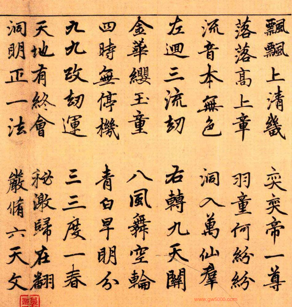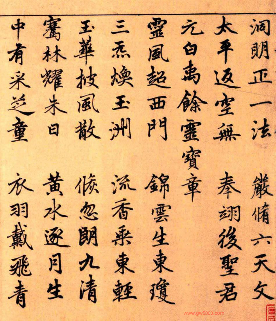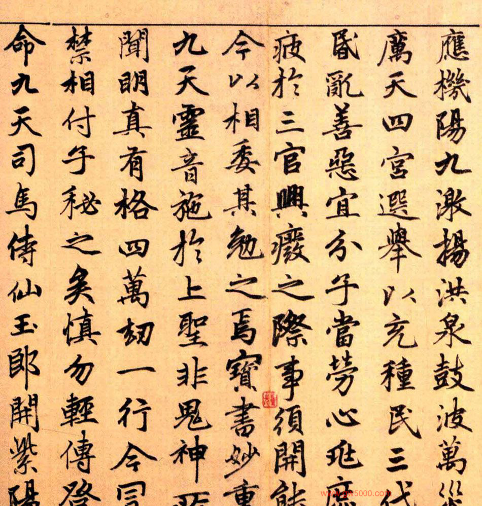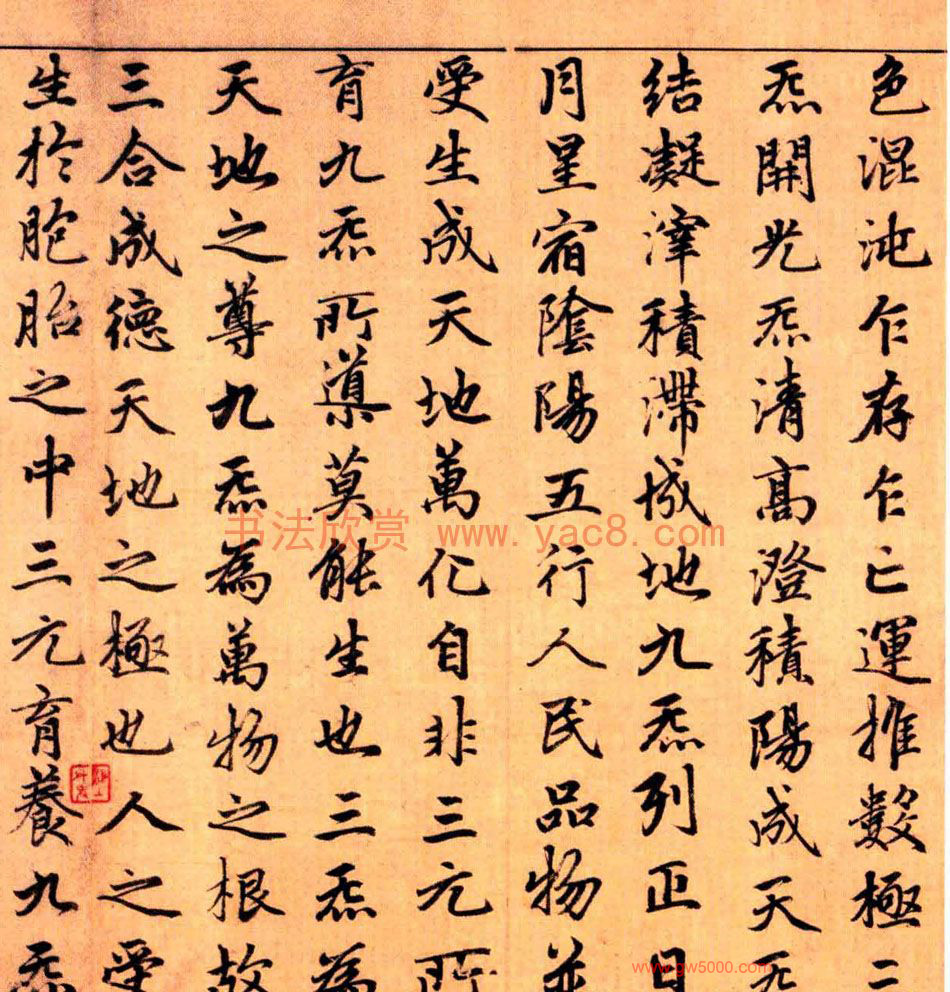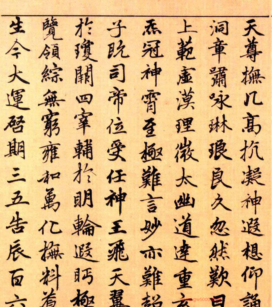 《洞玄灵宝自然九天生神章经》,简称《生神章》,是道教较早的重要经典之一,撰文者不详(约出于东晋)。此卷是辞官归湖州后的赵孟頫,应弟子张雨之请为钱塘隐真庵主何道坚所书,此为存世赵书中少见的长篇巨制,全文五千馀言,书法行笔流畅,字体端庄大方,首尾如一,极见功力。