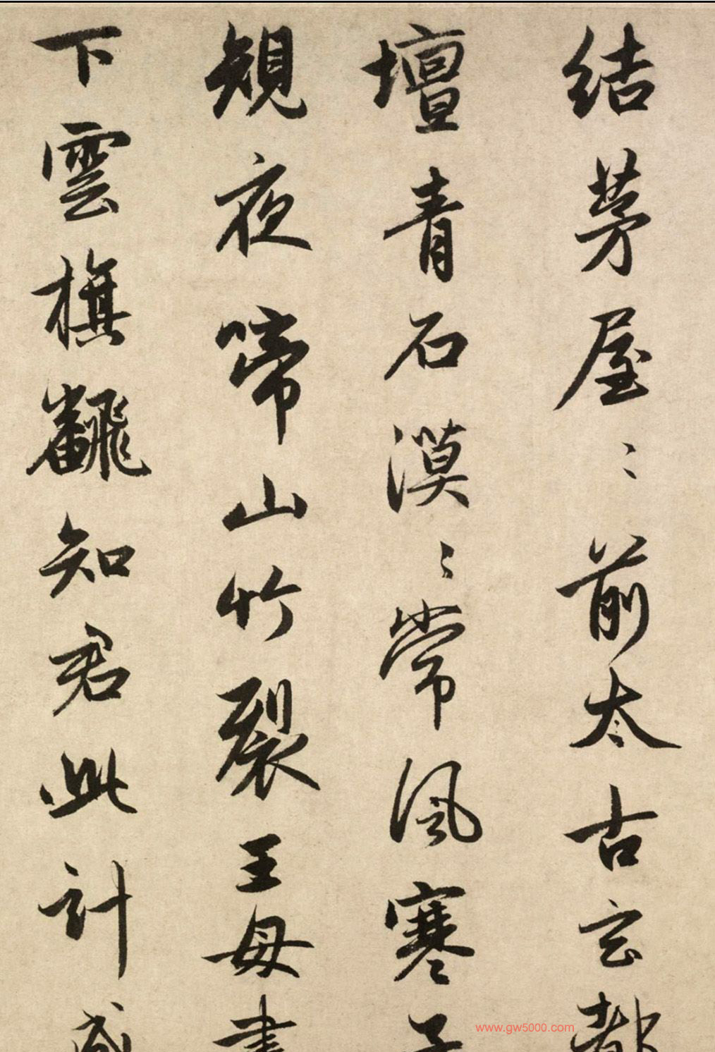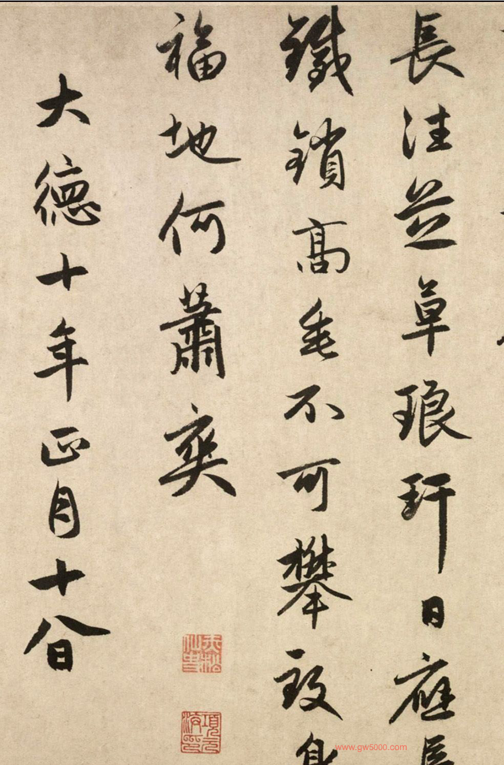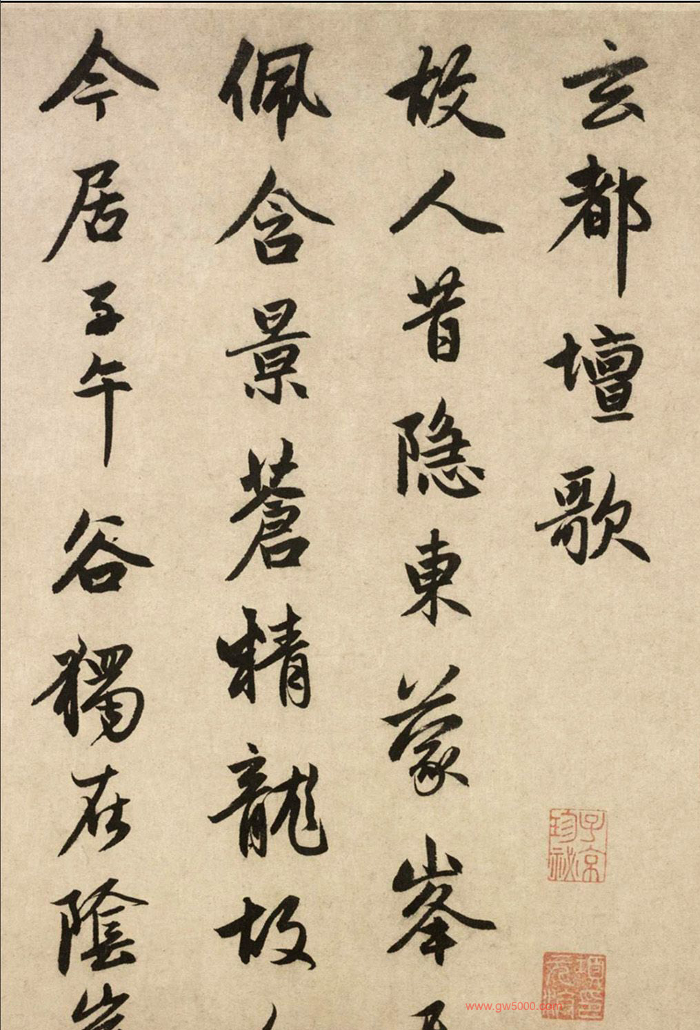 释文:玄都坛歌。故人昔隐东蒙峰,已佩含景苍精龙。故人今居子午谷,独在阴崖结茅屋。屋前太古玄都坛,青石漠漠常风寒。子规夜啼山竹裂,王母昼下云旗翻。知君此计成长往,芝草琅玕日应长。铁锁高垂不可攀,致身福地何萧爽。大德十年(1306)正月十八日,南谷尊师过我车桥之馆。要写古诗,乃书此篇。弟子吴兴松雪道人赵孟頫书。