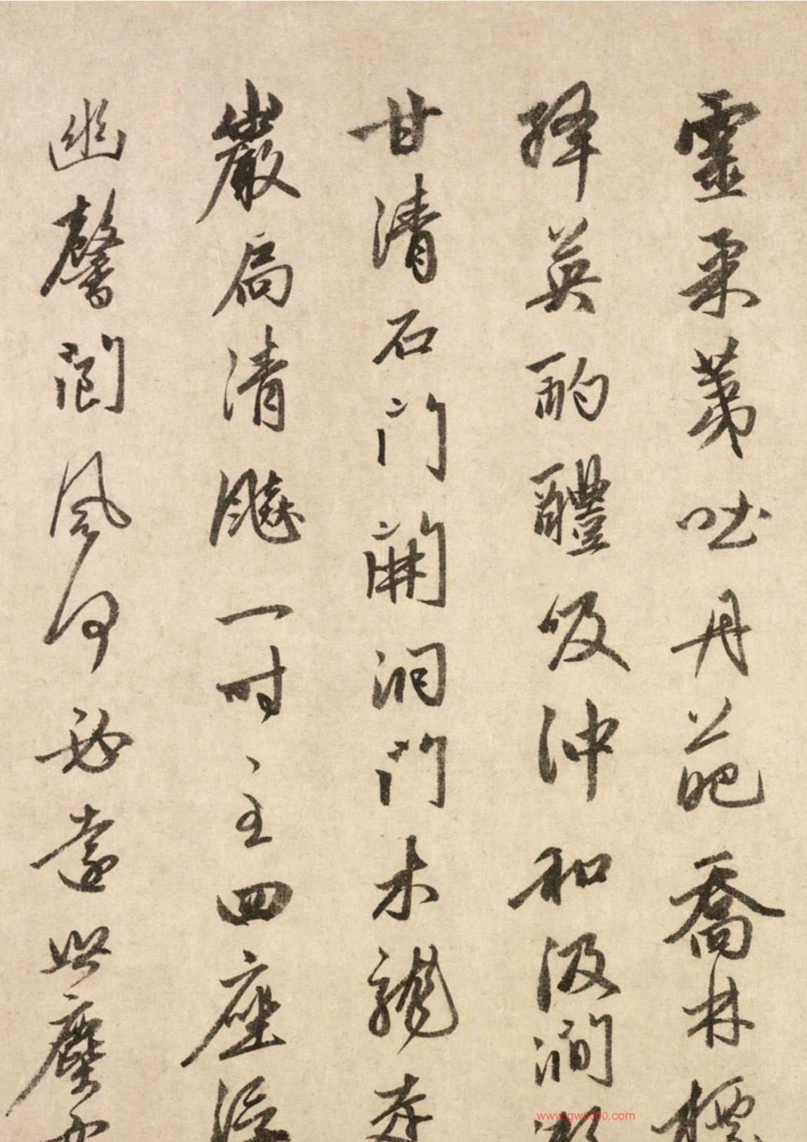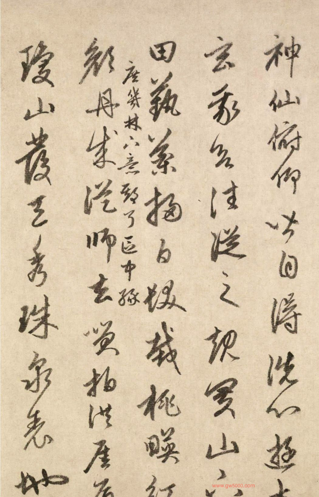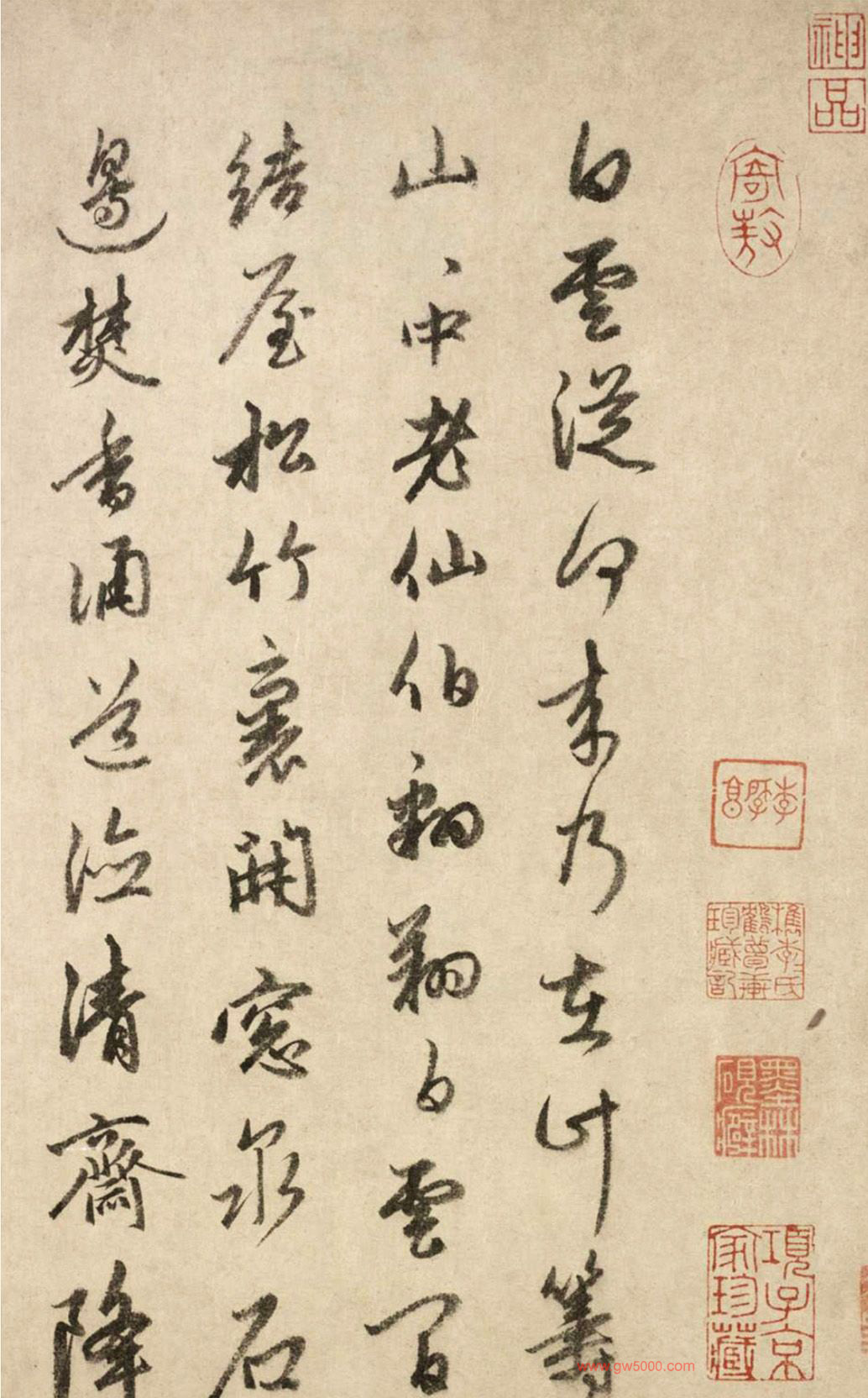 释文:白云从何来,乃在计筹山。山中老仙伯,翱翔白云间。结屋松竹里,开窗泉石边。焚香诵《道德》,清斋降神仙。俯仰皆自得,洗心游太玄。我欲往从之,规买山下田。艺药扫白发,栽桃映红颜。庶几林下意,期了区中缘。丹成从师去,笑拍洪崖肩。 琼山发天秀,珠泉表地灵。柔荑吐丹葩,乔林标绛英。酌醴吸冲和,汲涧漱甘清。石门开洞门,木龙走岩扃。清飚一时至,四座浮幽馨。阆风何必远,世尘空自冥。从游当有期,淹留讵无成。左手撷紫芝,右手采黄精。振衣陟崇冈,遐观散神情。长啸烟雾里,满空鸾鹤声。吾昔年为先师杜真人赋此二诗,今其弟子袁安道来索书,因写与使藏之。延祐六年十二月廿九日松雪斋书。子昂。前诗似更有二句,然老昏忘之矣。