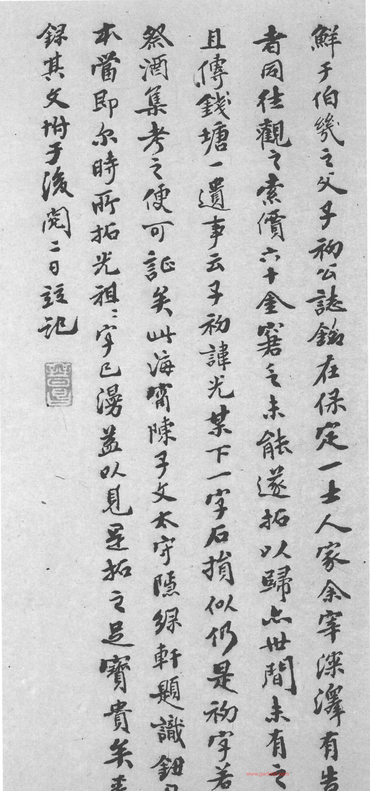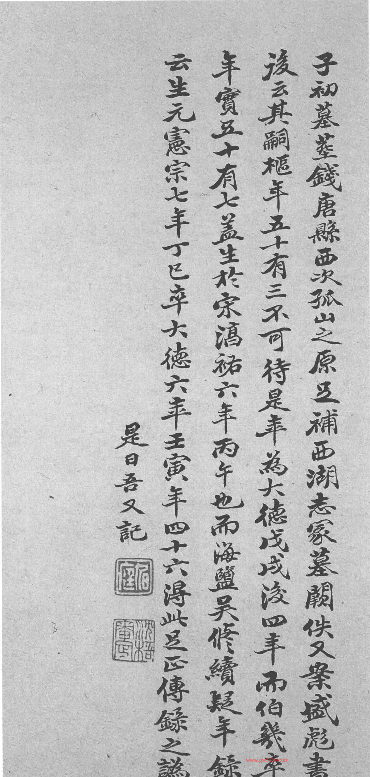 鲜于光祖(1205-1281),字子初,鲜于枢的父亲。墓志铭中未记述刻石时间,但据文中赵孟頫「奉训大夫、兵部郎中」的官衔,可知志文大约书丹于至元二十四年(1287年)秋。这一年,赵孟頫受元世祖忽必烈召见,被赞为「神仙中人」,遂仕于大都,时年三十四岁。