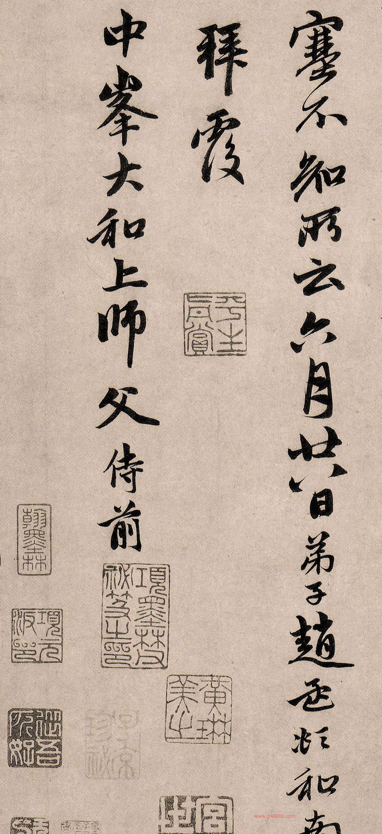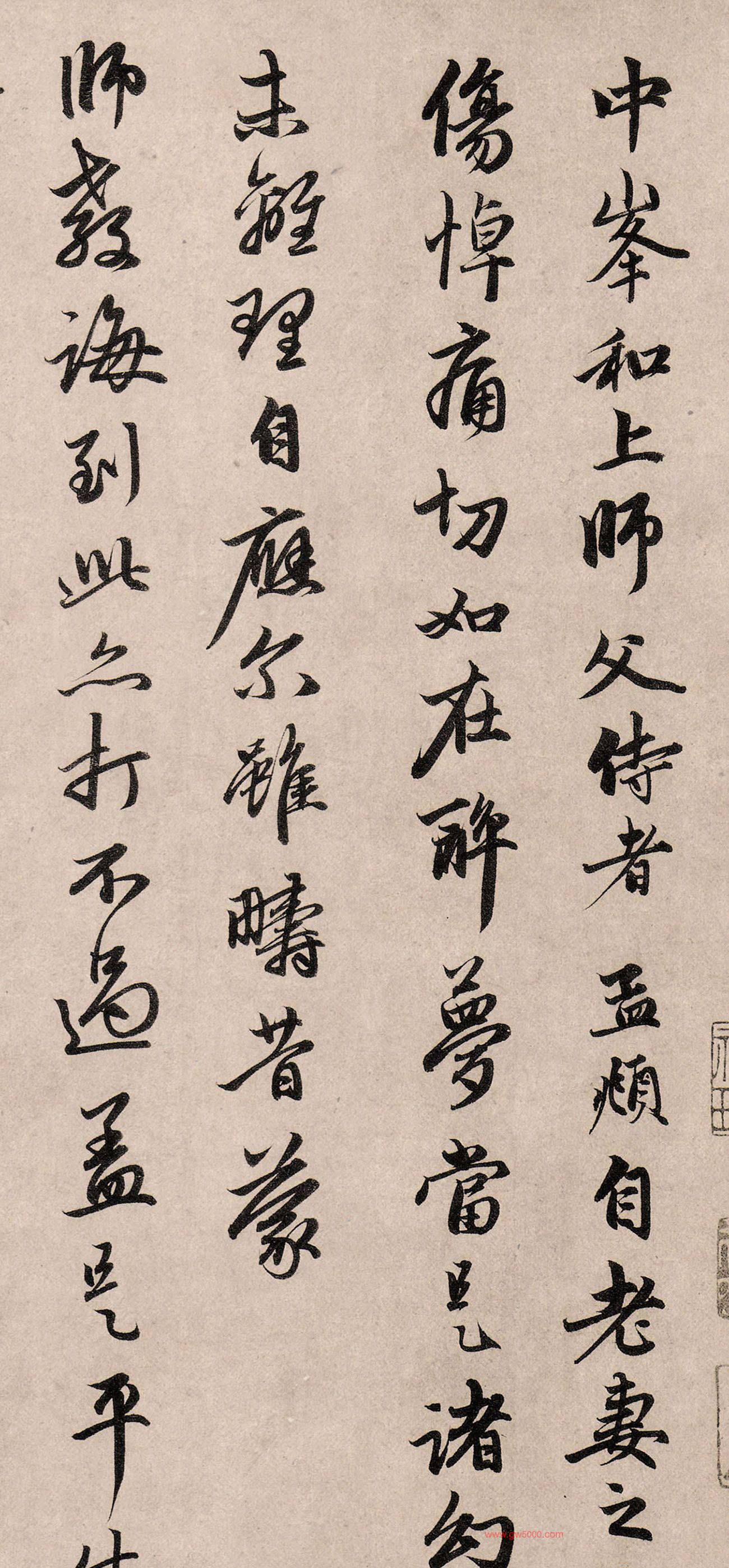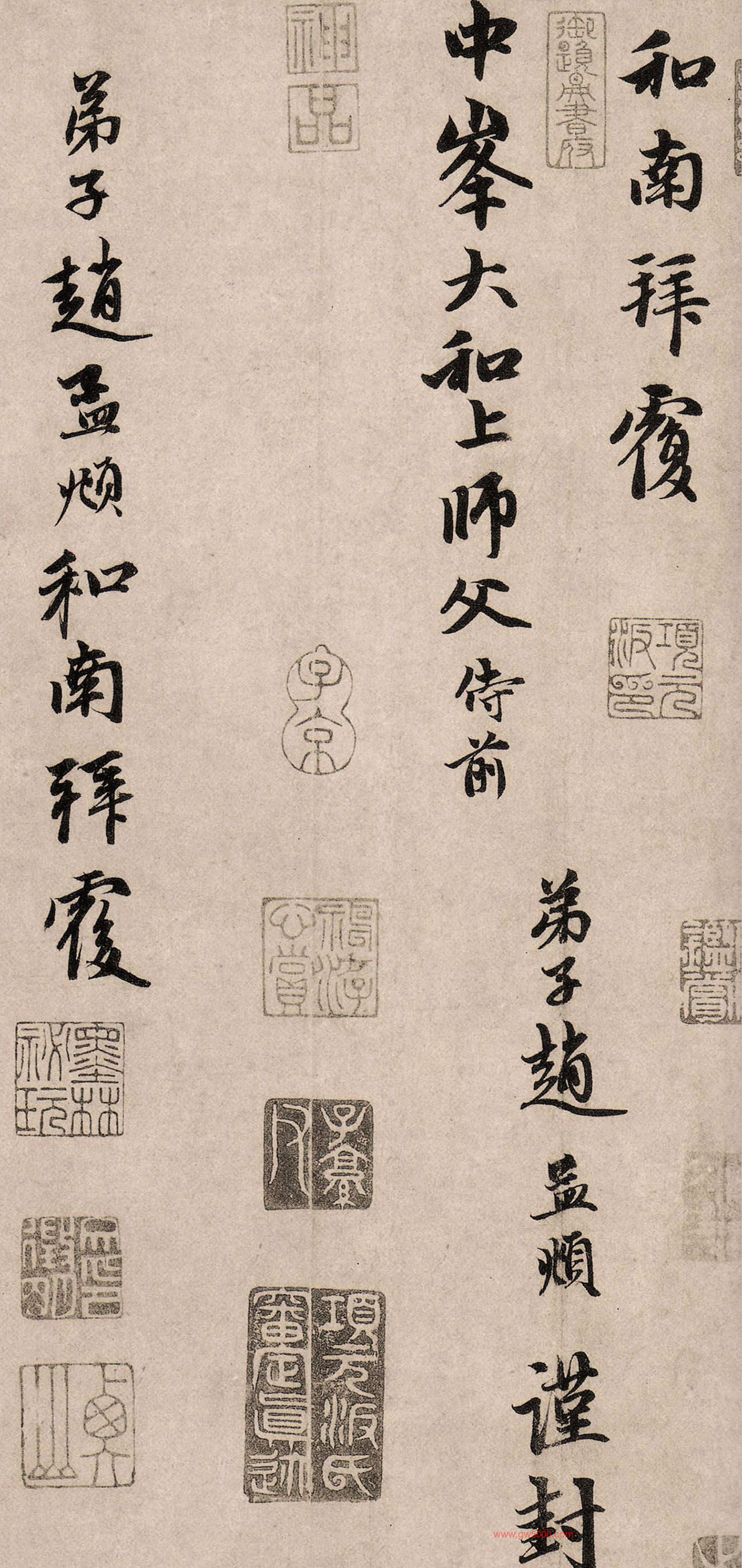 和南拜覆中峰大和上师父侍前,弟子赵孟頫谨封。弟子赵孟頫和南拜复中峰和上师父侍者:孟頫自老妻之亡,伤悼痛切,如在醉梦。当是诸幻未离,理自应尔。虽畴昔蒙师教诲,到此亦打不过,盖是平生得老妻之助整卅年,一旦丧之,岂特失左右手而已耶?哀痛之极,如何可言。过蒙和上深念,远遣师德,赐以法语,又重以悼章,又加以祭文,亡者得此,固当超然于死生之涂,决定无疑。至于祭馔之精,又极人间盛礼,尤非所宜。蒙殁存感戢,不知将何上报师恩。虽亡者妄身已灭,然我师精神之所感通,尚不能无望于慈悲拯拔,俾证菩提,此则区区大愿。因俊兄还山,谨此具复,临纸哽塞,不知所云。六月廿八日,弟子赵孟頫和南拜复中峰大和上师父侍前。