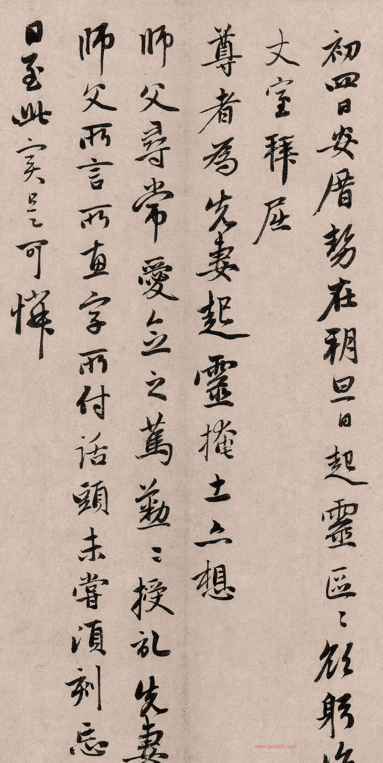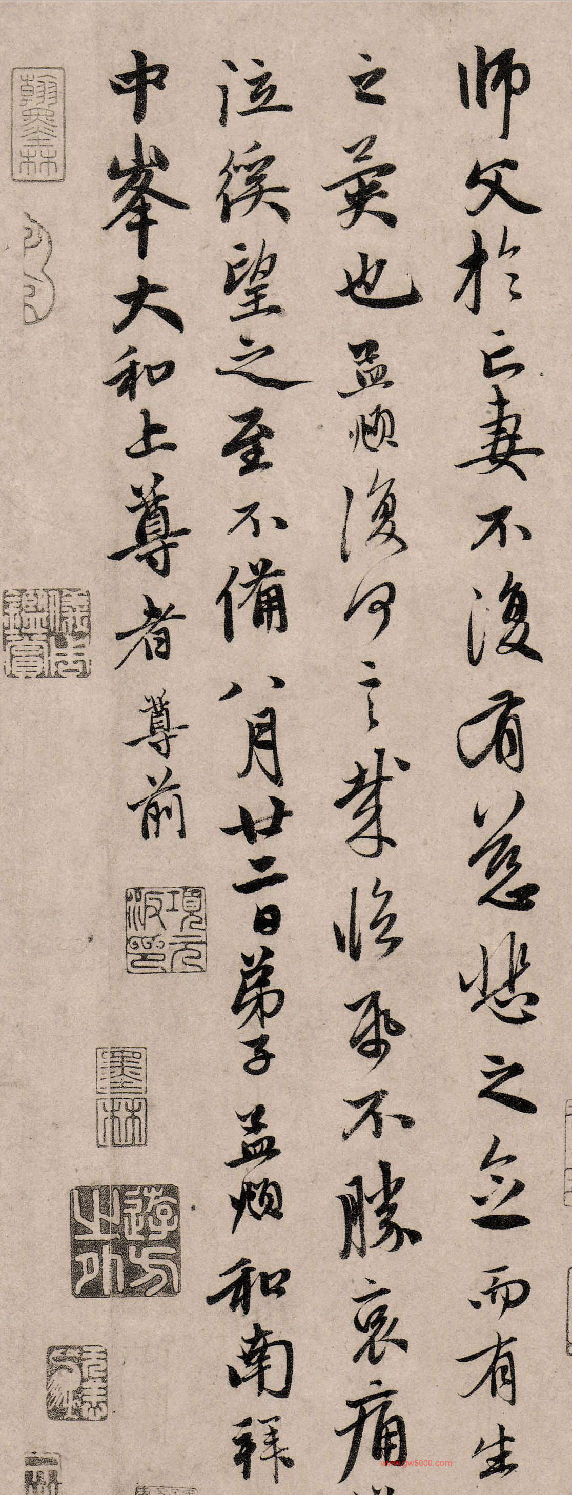 孟頫近者拜书,谢丹药之惠,言不尽意,想蒙深察,雨后渐凉,山中气当已寒,伏惟道体安隐。孟頫自先妻云亡,凡事罔知所措,幸得雍子种种用力,稍宽燋烦。两日来觉眠食粗佳,但衰年无绪,终是苦恼。小儿时去东衡,营治丧事,略有次第,择九月初四日安厝,势在朔旦日起灵,区区欲躬诣丈室,拜屈尊者为先妻起灵掩土,亦想师父寻常爱念之笃,勤勤授记。先妻余师父所言所惠字所付话头,未尝顷刻忘,今日至此,实是可怜。师父无奈何,只得特为力疾出山,庶见三生结集,非一时偶然会合之薄缘耳。弟子本当亲去礼拜,而老病不可去,欲令小儿去,又以丧葬事繁,萃于此子,又去不得,故专俛月师兄代陈下情,惟师父慈悲必肯为弟子一来,若蒙以他故见拒,则是师父于亡妻,不复有慈悲之念,而有生死之异也,孟頫复何言哉。临纸不胜哀痛涕泣徯望之至,不备。八月廿二日。弟子孟頫和南拜覆 中峰大和上尊者尊前。
