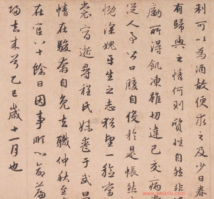 释文:“归去来辞并序。余家贫,耕植不足以自给。幼稚盈室,瓶无储粟,生生所资,未见其术。亲故多劝余为长吏,脱然有怀,求之靡途。会有四方之事,诸侯以惠爱为德。家叔以余贫苦,遂见用为小邑。于时风波未息,心惮远伇。彭泽去家百里,公田之利,可以为酒,故便求之。及少日,眷然有归与之情。何则?质性自然,非矫励所得。饥冻虽切,违己交病。尝从人事,皆口腹自伇。于是怅然慷慨,深愧平生之志。犹望一稔,当敛裳宵逝。寻程氏妹丧于武昌,情在骏奔,自免去职。仲秋至冬,在官八十馀日。因事顺心,命篇曰《归去来兮》。乙巳岁十一月也。
