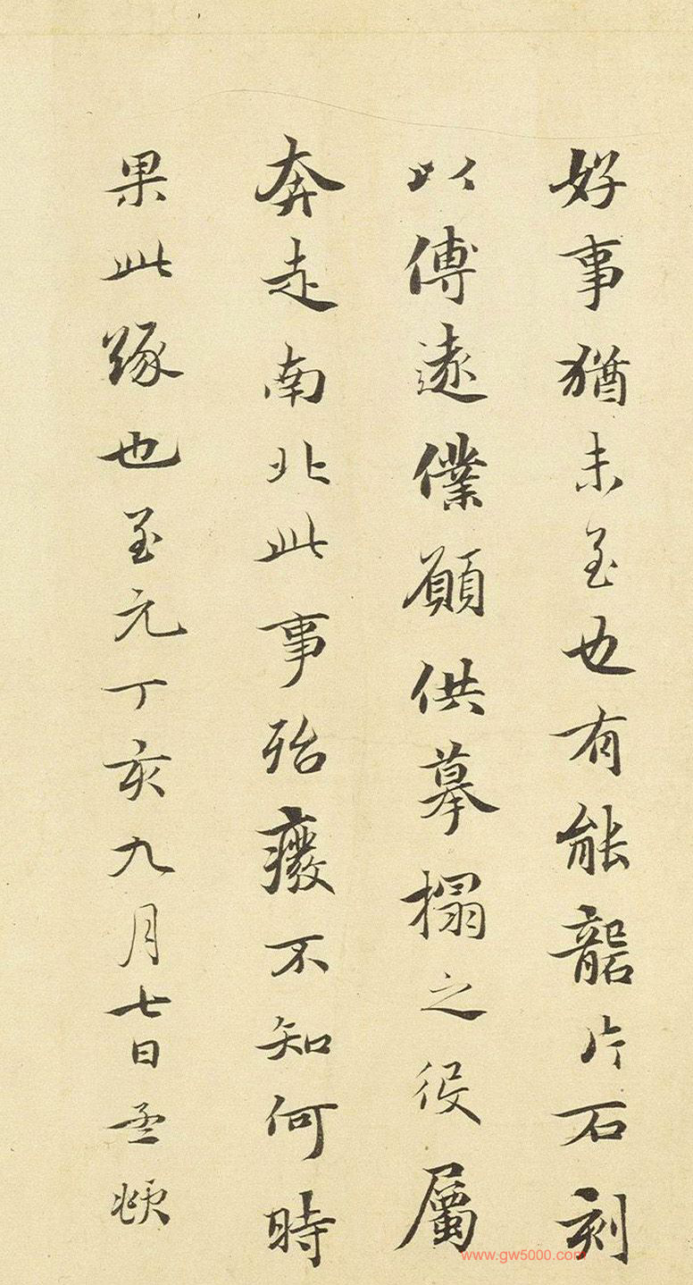 释文:梁武评书至右军,谓“龙跳天门,虎卧凤阁”,此帖是已。诸家刻中皆未之有,世间神物岂默有靳惜者不欲使滥传耶。将好事犹未至也。有能砻片石刻以传远,仆愿供摹搨之役属。奔走南北,此时殆废,不知何时果此缘也。至元丁亥九月七日题。孟頫。