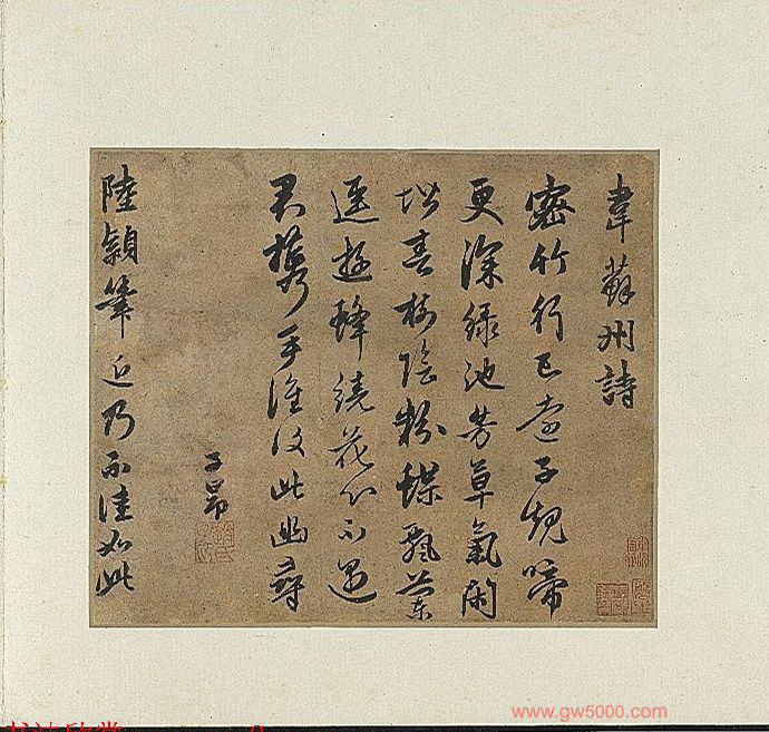 释文:韦苏州诗。密竹行已远。子规啼更深。绿池芳草气。闲阶春树阴。粉蝶飘兰迳。游蜂绕花心。不遇君携手。谁复此幽寻。子昂。陆颖笔近乃不佳如此。